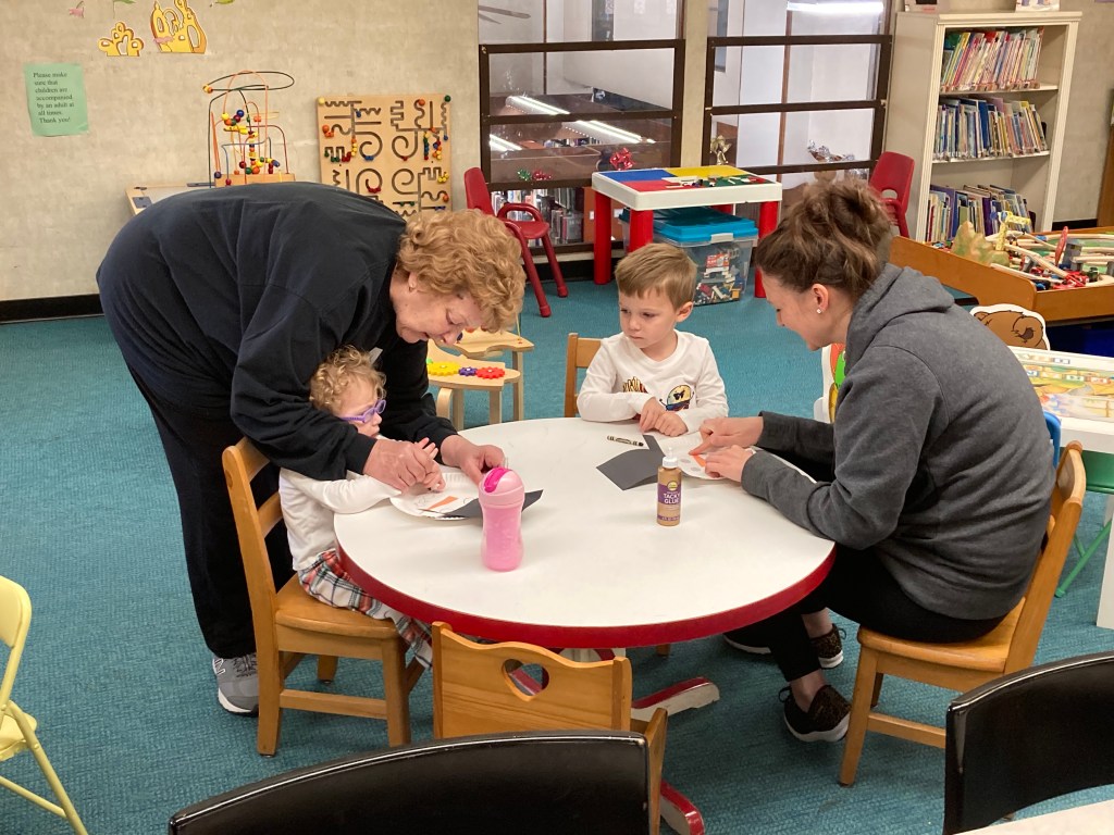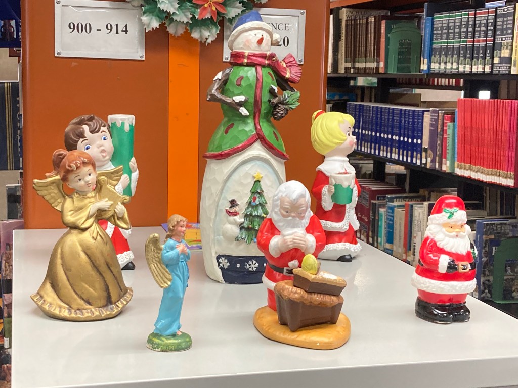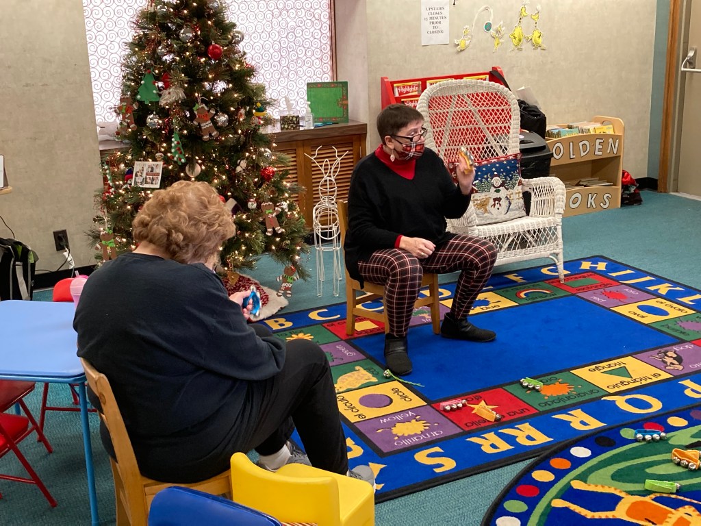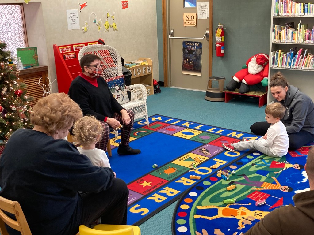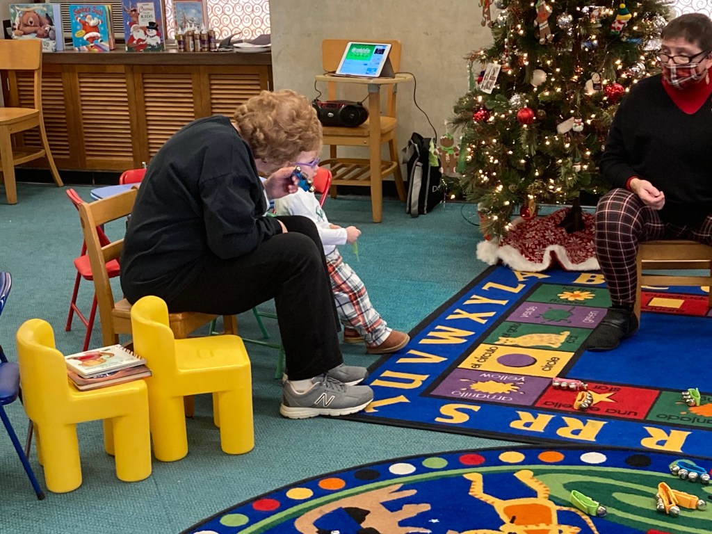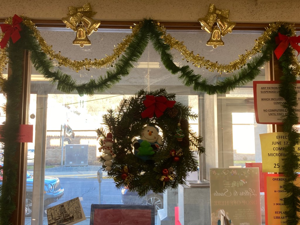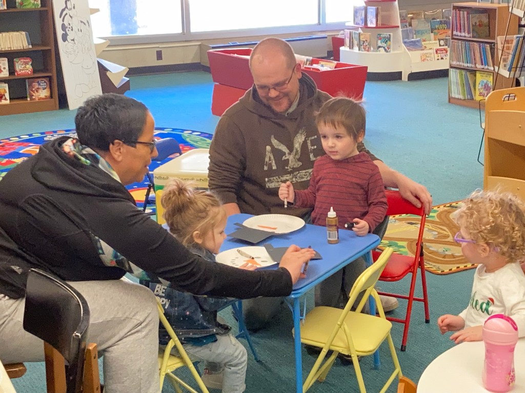 Check out our festive holiday decorations placed all throughout the library! We would also like to thank Lisa Eccker for her lovely paintings in the front windows that will undoubtedly spread cheer to all those who pass by. Also included here are some snapshots of our latest Preschool Storytime & Movement program where we read a book about snowmen, sang songs about the jingling bells on Santa’s sleigh, and even crafted some friendly snowmen for everyone to take home!