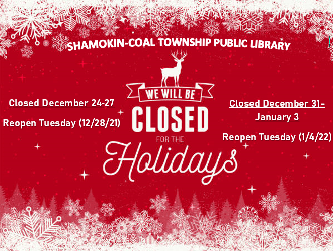 May our patrons and everyone throughout the Shamokin and Coal Township communities have a safe and merry holiday season! We look forward to continuing to serve the community’s educational, recreational, and cultural needs in our quest to support lifelong learning and enrichment for all those who walk through our doors. It’s our honor to provide the best possible materials and services that we can as we close one year, start anew, and find out where our story together will take us in 2022!