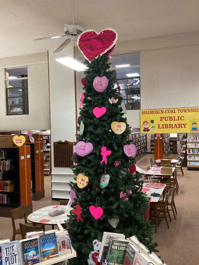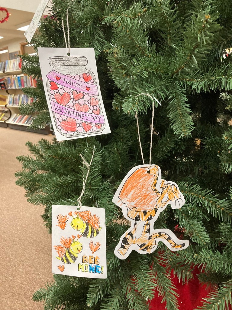 Our Valentine’s Day tree is coming along quite nicely so far! We’ve had patrons of all ages color ornaments and certainly encourage more folks to join in throughout the coming weeks. Come down to the library to browse our diverse collection of materials and contribute to our holiday tree while you’re here!