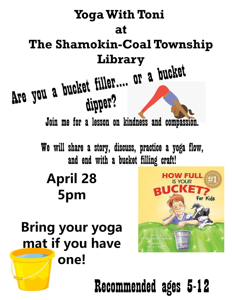 Join us at the library for another session of Children’s Yoga with Toni! We will share a story, discuss, practice a yoga flow, and end with a bucket craft. This is a free event and will begin at 5 PM upstairs at the library.
