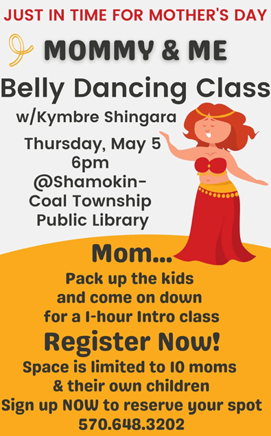 **REMINDER**Just in time for Mother’s Day, Kymbre Shingara will be leading a free belly dancing class for Moms and their children at the Shamokin-Coal Township Pubic Library on Thursday, May 5th at 6 PM!