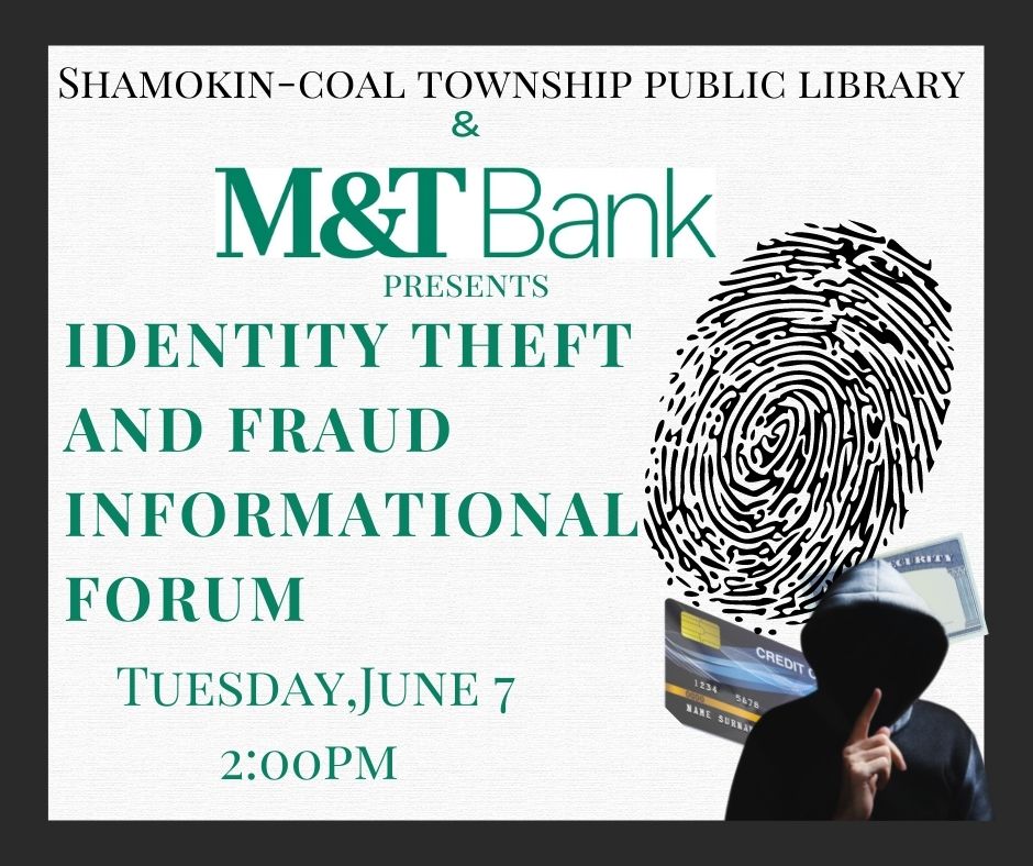 **REMINDER** Volunteers from M&T Bank will be giving 2 separate free presentations throughout the month of June covering ideal methods and best practices for keeping your identity/personal information secure. The first of these presentations is this coming Tuesday (June 7th) at 2 PM at the library!