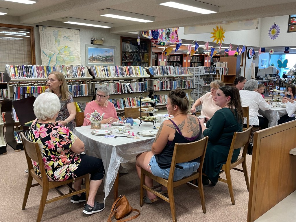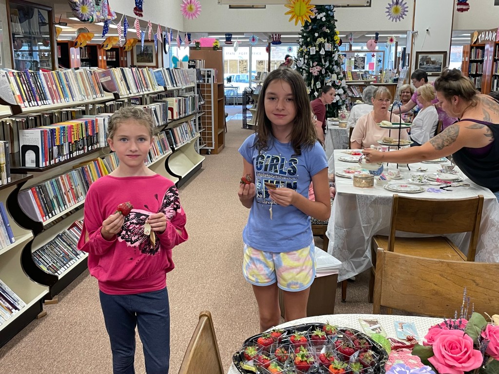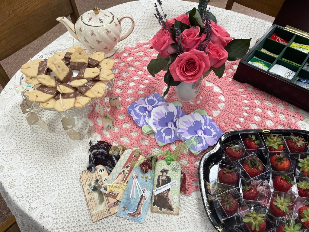Yesterday evening at the library a tea party and bookmark making event was held. The evening included cucumber sandwiches, chicken & ham salad finger sandwiches, teabag shortbread cookies, strawberries dipped in chocolate, and of course tea! Along with the full tea party experience, lots of supplies to create personalized bookmarks were also available. A special thank you goes to Jeanne Shaffer and the NCCAH for partnering with us for this event.