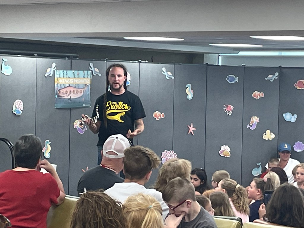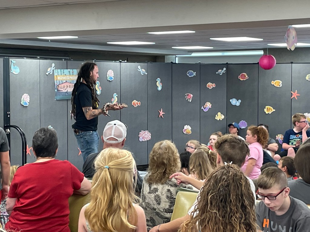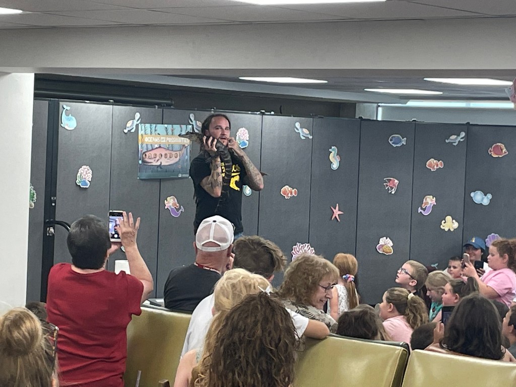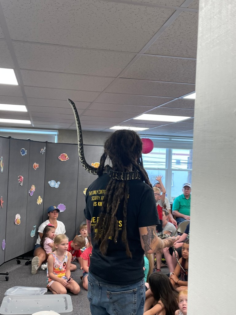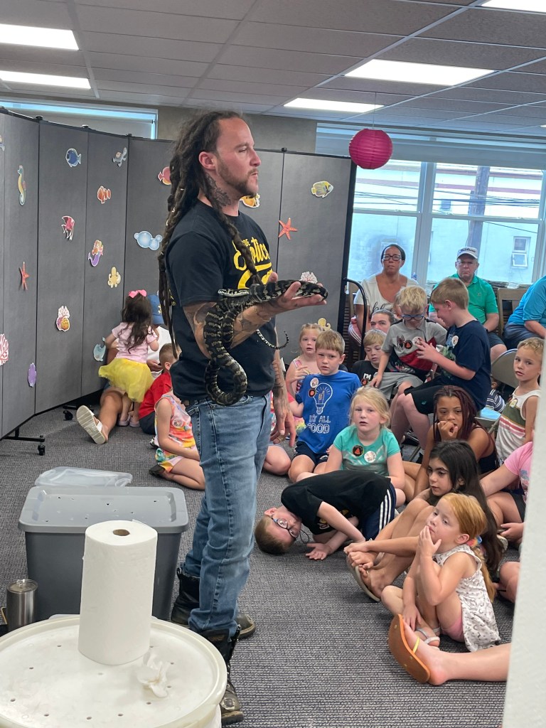 We would like to thank Cameron English of CDE Exotics for visiting our library this morning for Summer Reading Week 2. This morning’s program included an alligator, two turtles, and three different snakes. Towards the end, everyone even had the chance to pet Gary the Snake!
