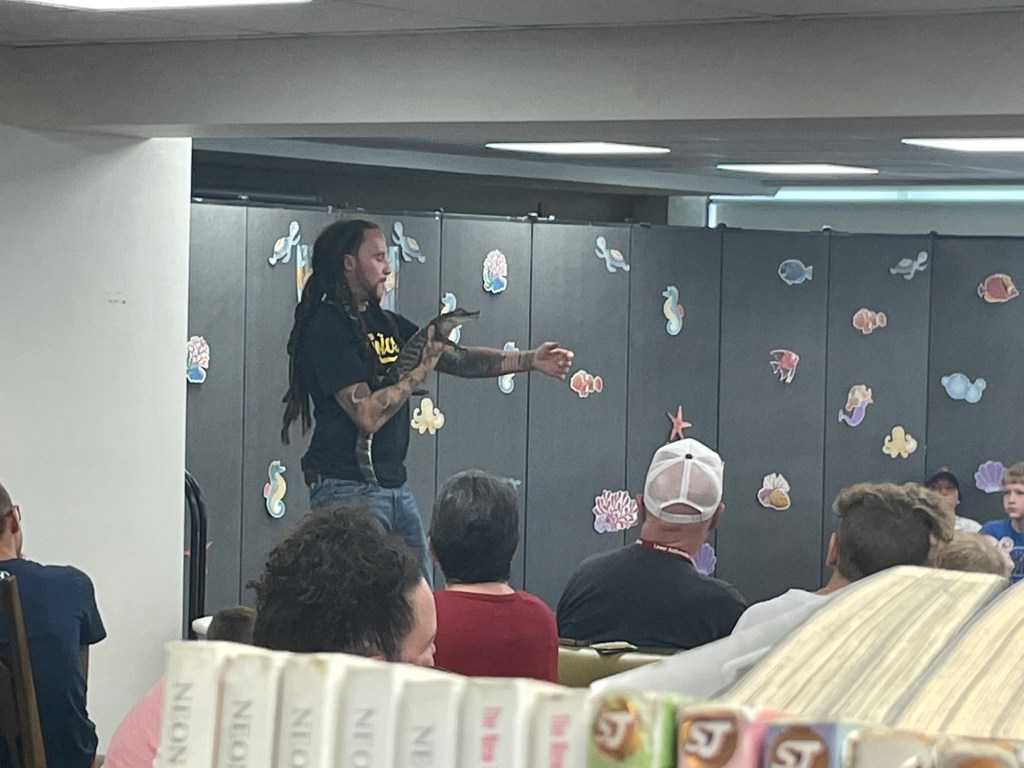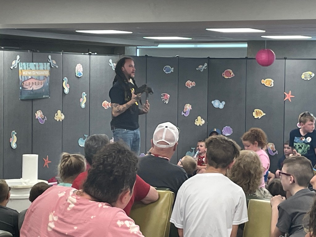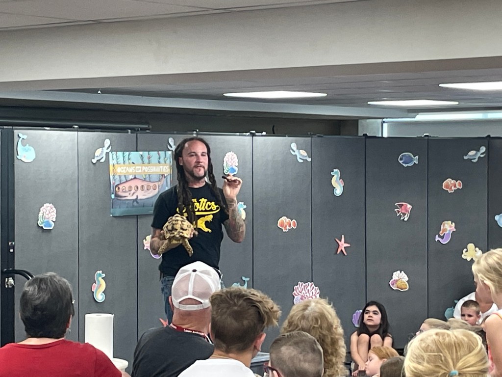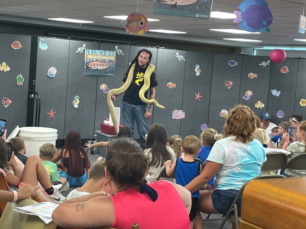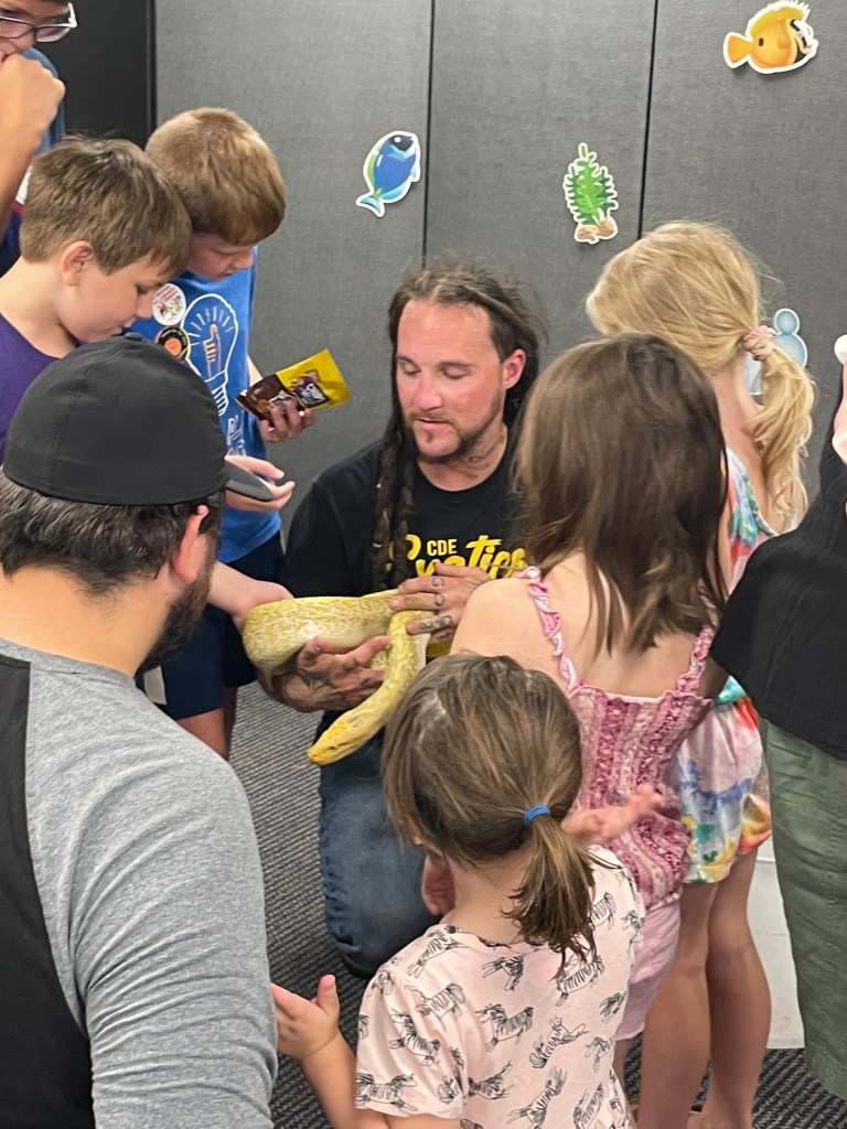 We would like to thank Cameron English of CDE Exotics for visiting our library this morning for Summer Reading Week 2. This morning’s program included an alligator, two turtles, and three different snakes. Towards the end, everyone even had the chance to pet Gary the Snake!