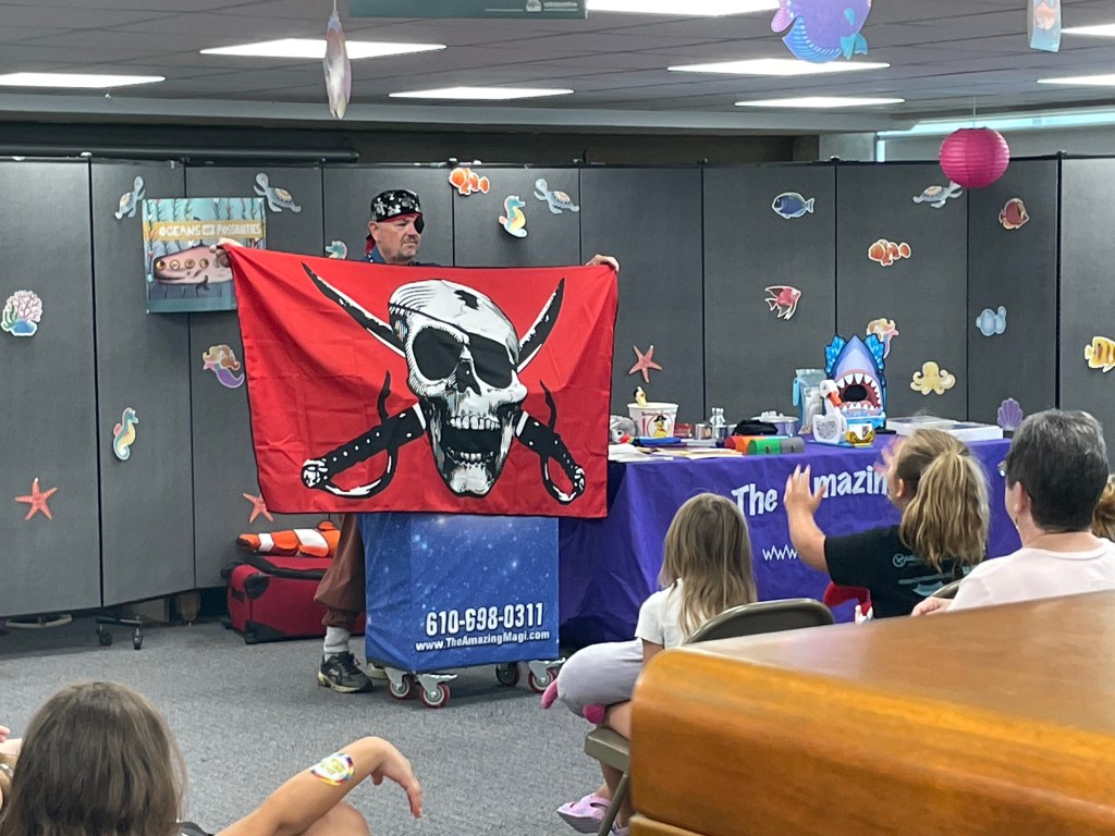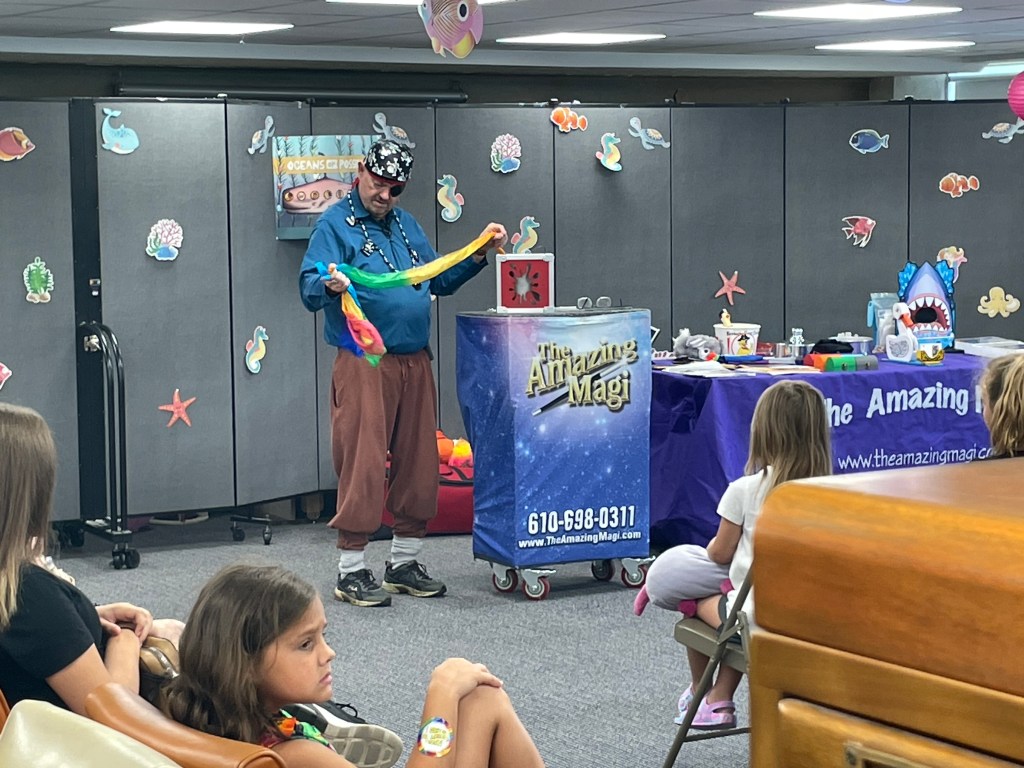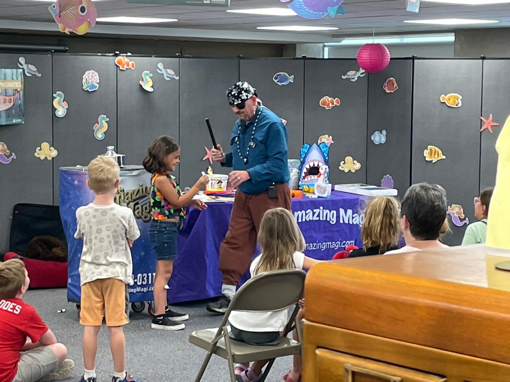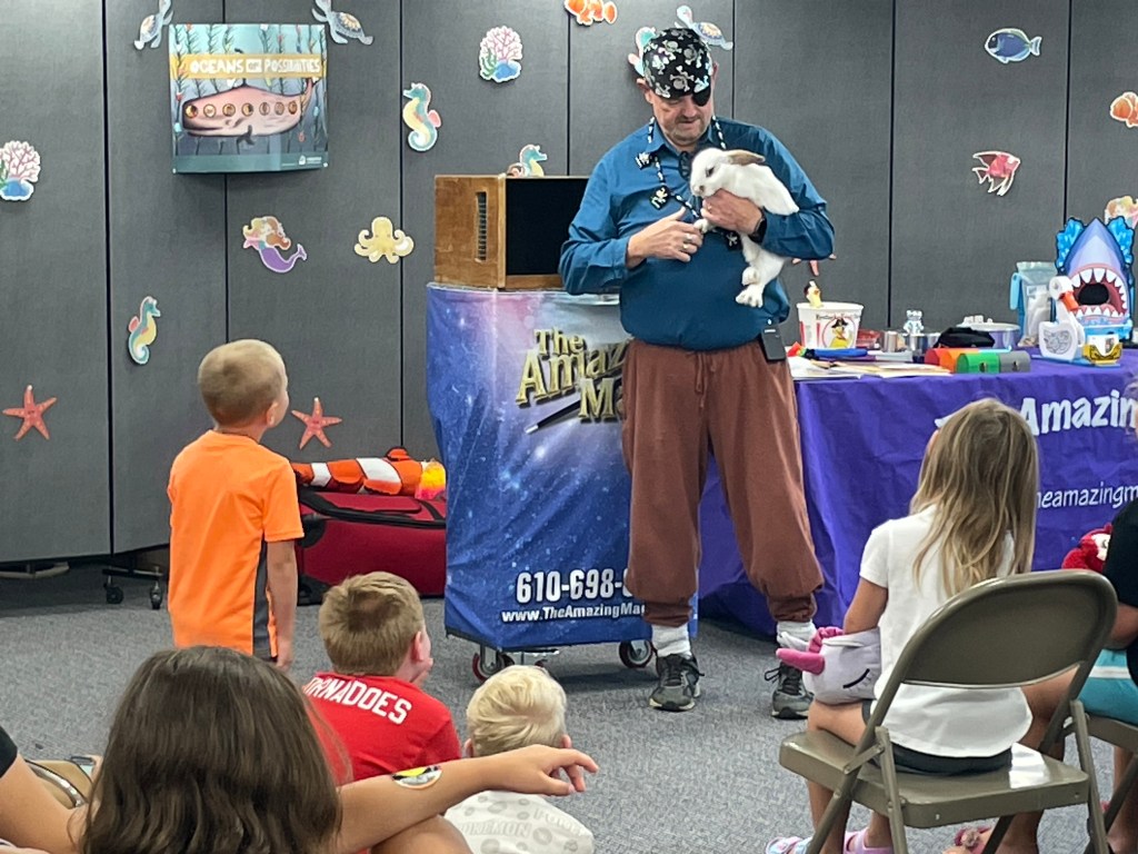 For Summer Reading Week 3, the library hosted The Amazing Magi and his magic show “Pirate Mike and His Quest for Treasures of the Sea”. The show included sleight of hand tricks, a talking seal, and even a live rabbit that magically appeared! Our thanks to The Amazing Magi (Michael Reist) for bringing both his show and his positive message about the importance of reading to our library.