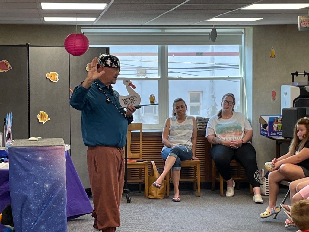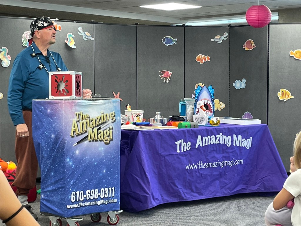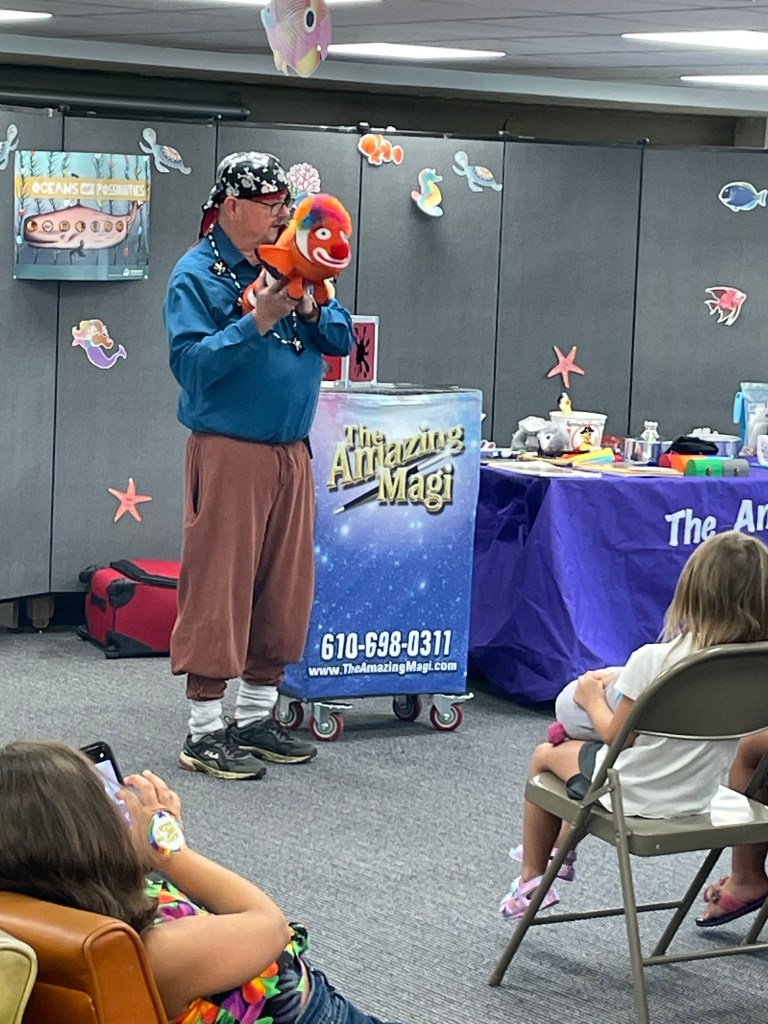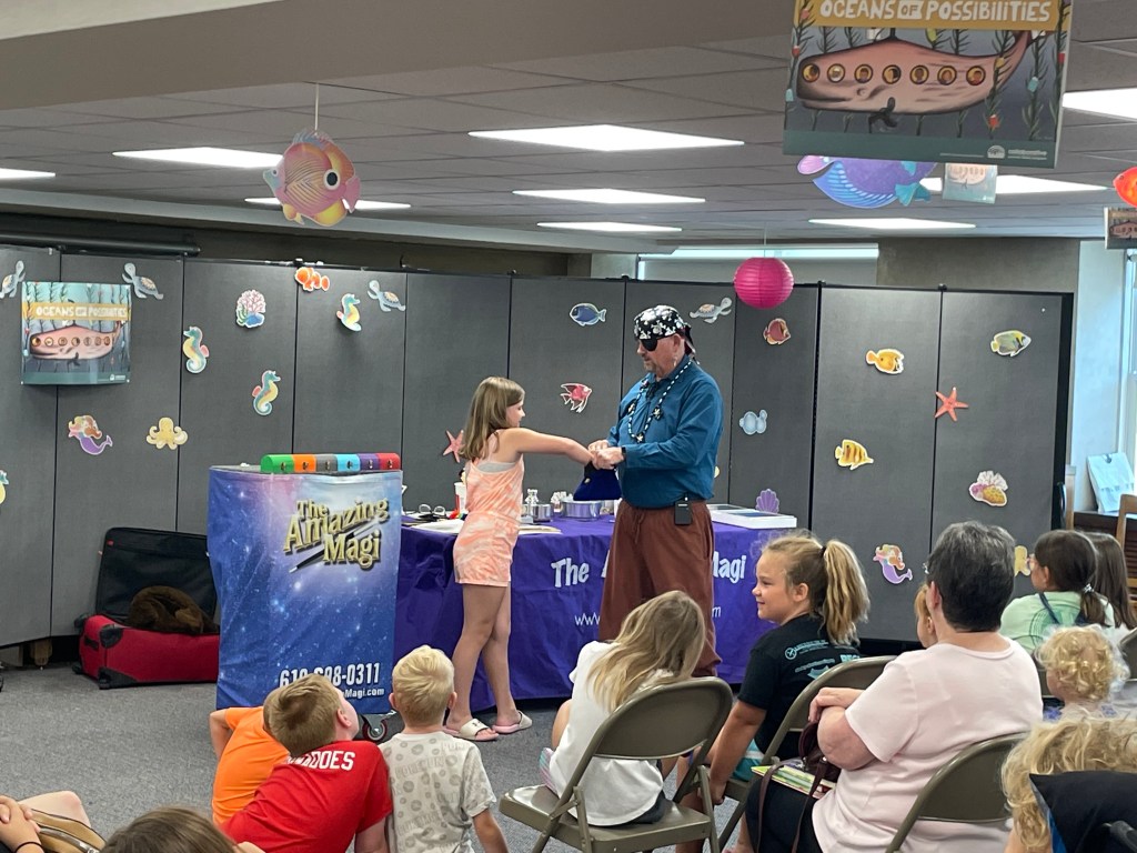 For Summer Reading Week 3, the library hosted The Amazing Magi and his magic show “Pirate Mike and His Quest for Treasures of the Sea”. The show included sleight of hand tricks, a talking seal, and even a live rabbit that magically appeared! Our thanks to The Amazing Magi (Michael Reist) for bringing both his show and his positive message about the importance of reading to our library.