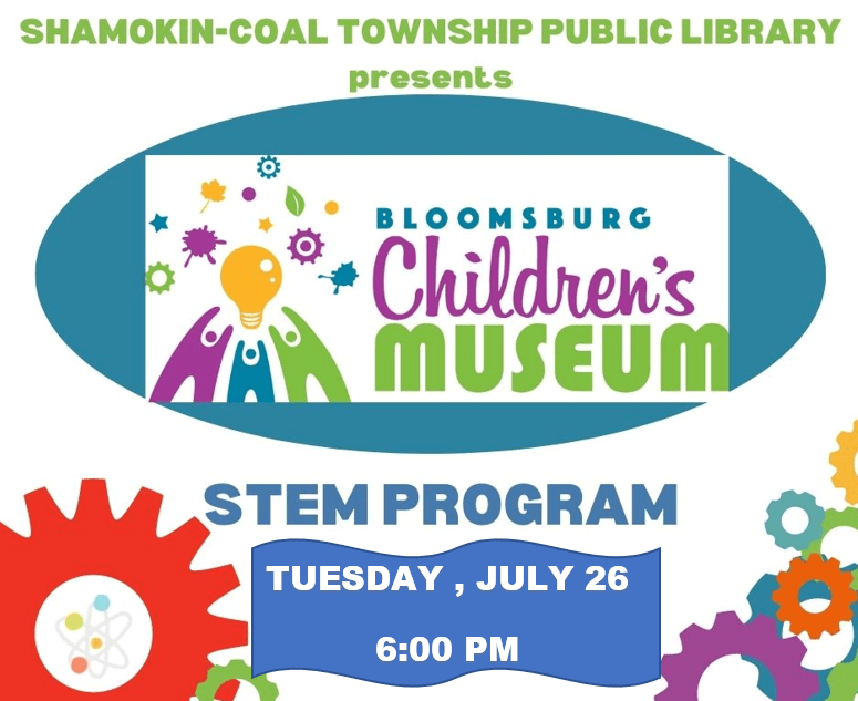 For almost the entire rest of the year, Bloomsburg Children’s Museum will be visiting our library once a month for some imaginative and exciting STEM (science, technology, engineering, mathematics) programs! The upcoming program entitled “Build a Boat” will be held this coming Tuesday (7/26) at 6 PM. The targeted age range for these events is ages 6-13. While these are free events, we do ask that children are signed up ahead of time as only approximately 20 slots will be available each time.