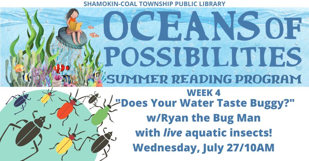 Summer Reading Week 4 at Shamokin-Coal Township Public Library is this Wednesday (7/27) at 10:00 AM! This week we have a very special treat for our young readers in the form Ryan the Bugman and his program “Does Your Water Taste Buggy?” featuring live aquatic insects.