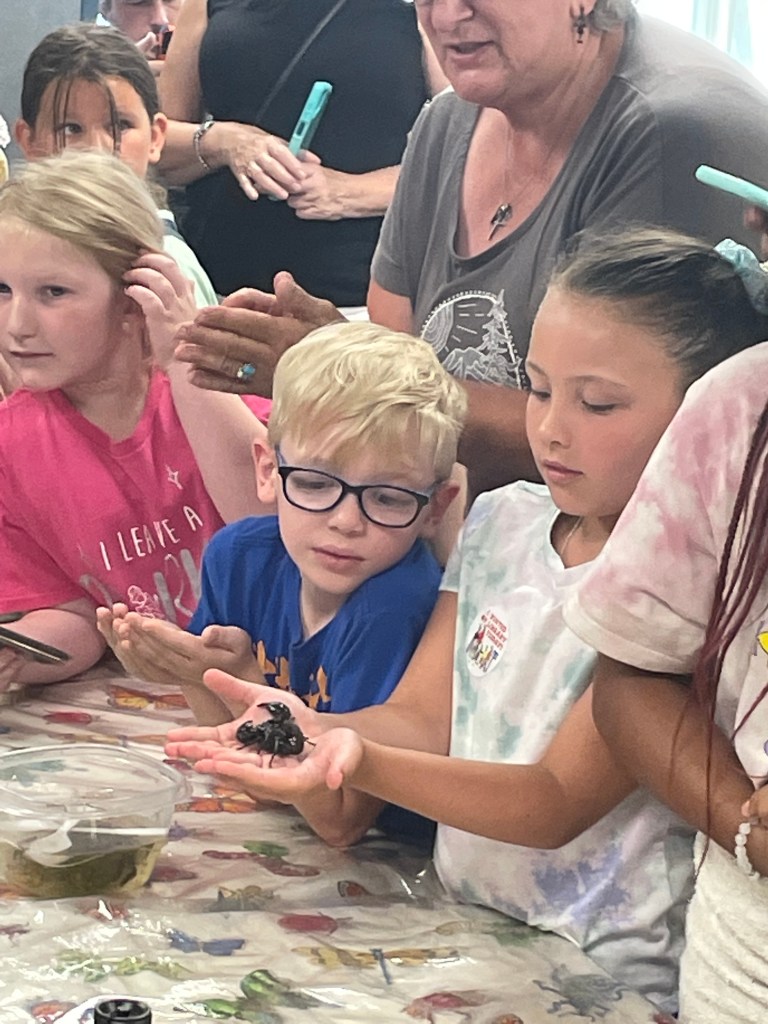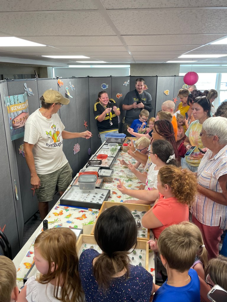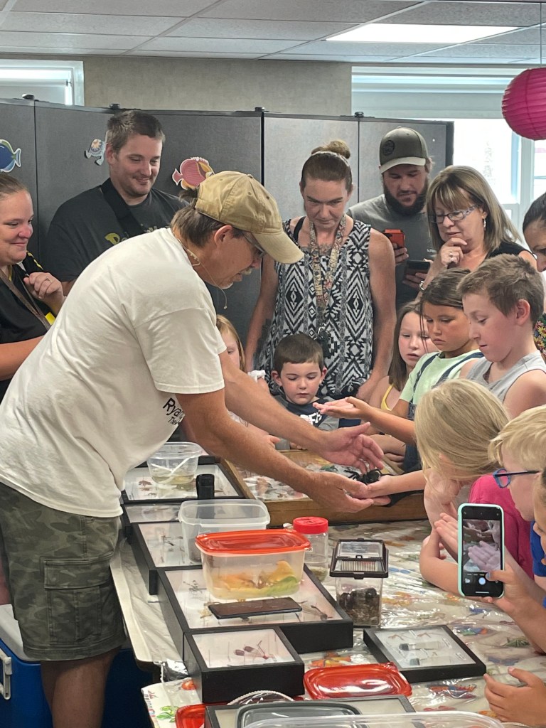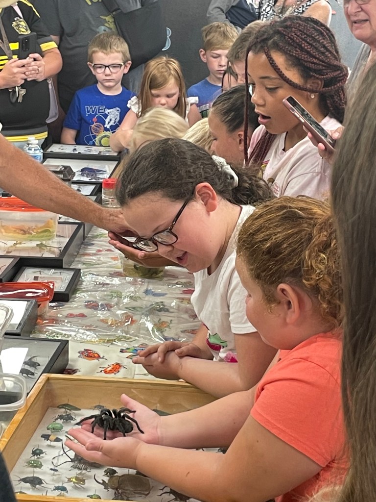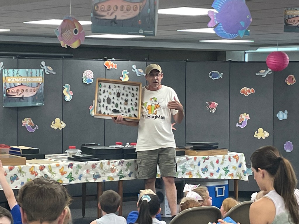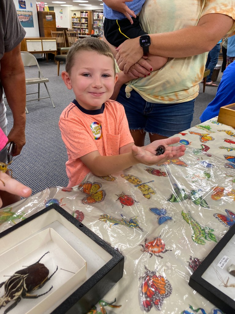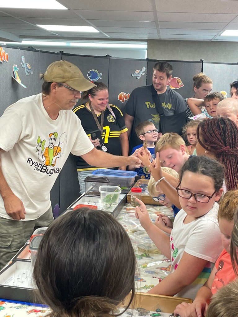 Those that attended Summer Reading Week 4 yesterday morning were treated to quite an event brought to us by Ryan Bridge “The Bug Man” who visited our library and brought with him over 100 preserved specimens and multiple live specimens. Towards the end of his educational program, both children and adults were given the opportunity to hold a live tarantula and a scorpion!
