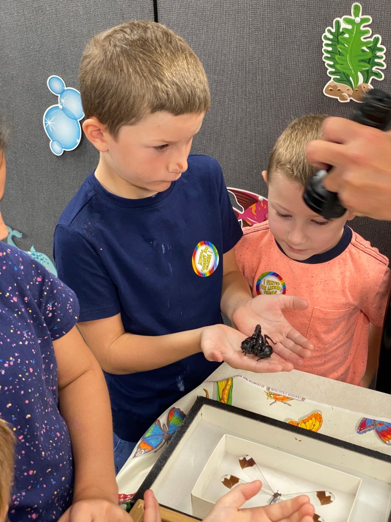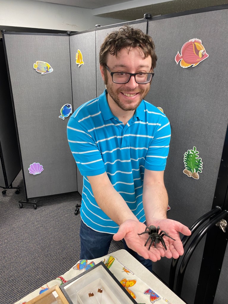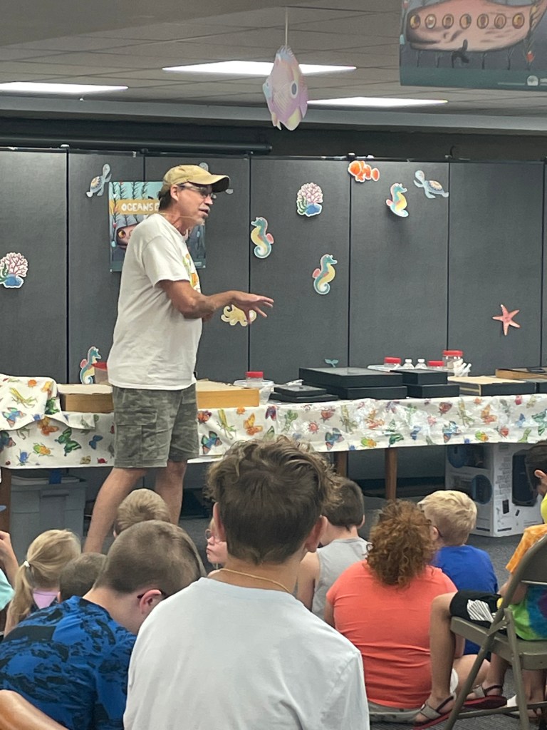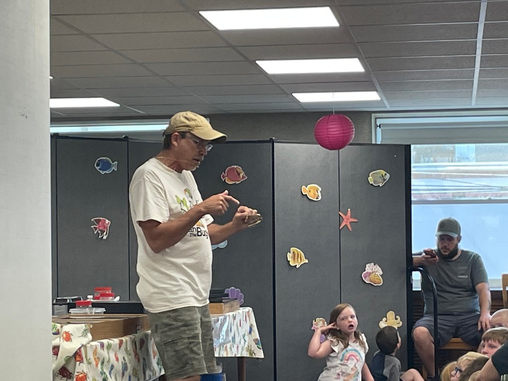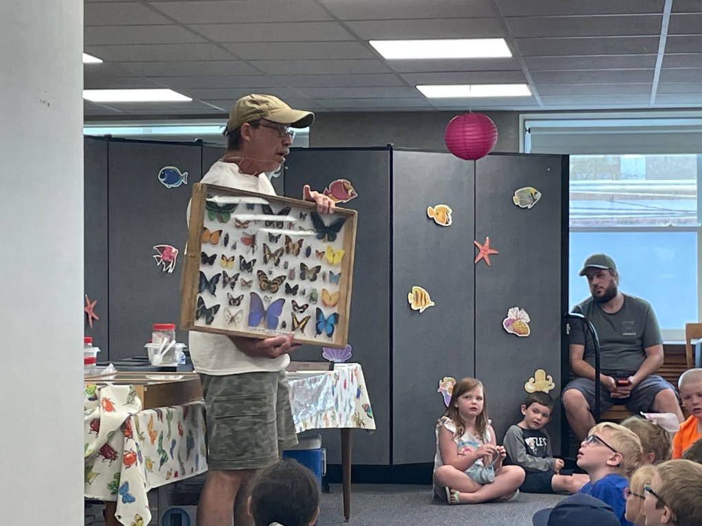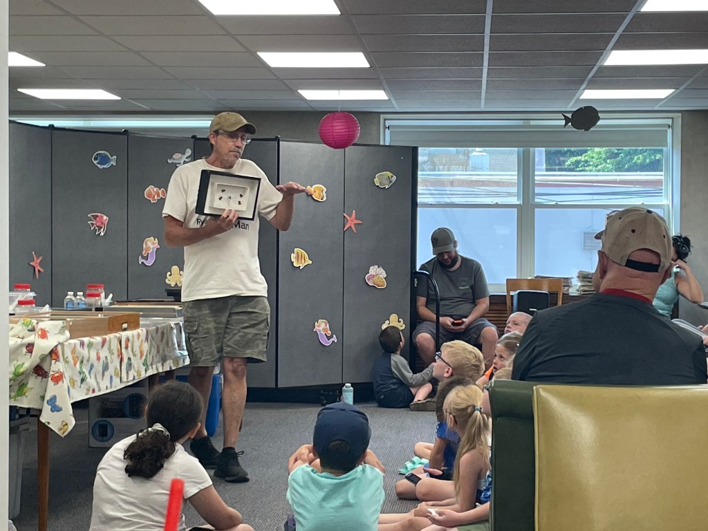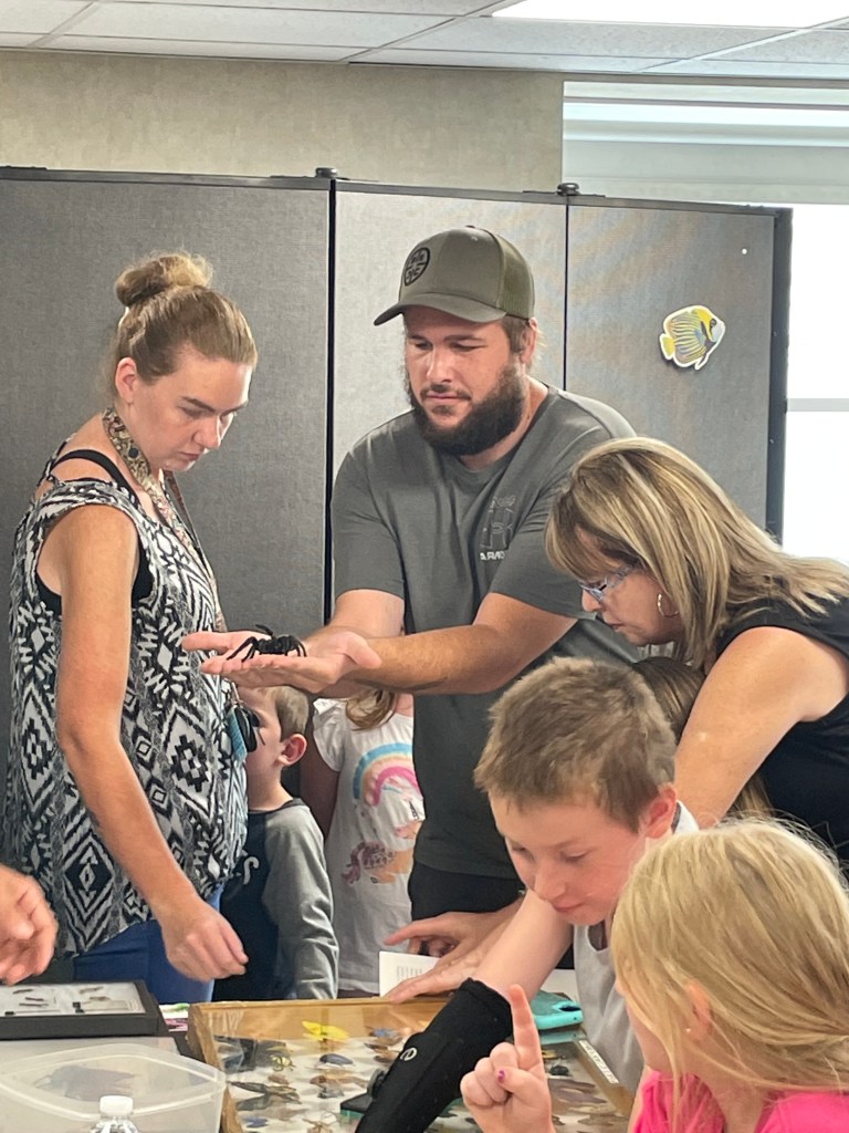 Those that attended Summer Reading Week 4 yesterday morning were treated to quite an event brought to us by Ryan Bridge “The Bug Man” who visited our library and brought with him over 100 preserved specimens and multiple live specimens. Towards the end of his educational program, both children and adults were given the opportunity to hold a live tarantula and a scorpion!