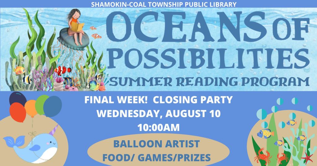 Summer Reading Week 6 at Shamokin-Coal Township Public Library is this Wednesday (8/10) at 10:00 AM! This week will be our last morning together for Summer Reading and the accomplishments of all our young readers will be celebrated with a party that will feature food, games, music, and even a balloon artist.
