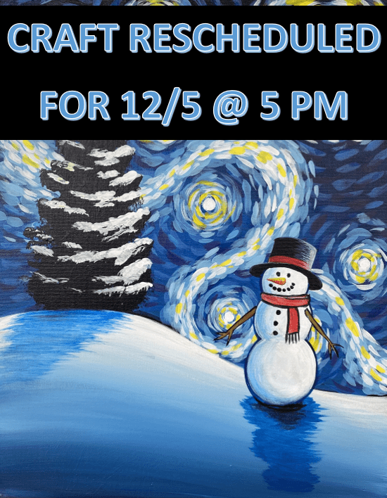 ATTENTION CRAFTERS! This evening’s adult craft has been rescheduled due to the impending winter weather. Our craft has now been rescheduled for Monday, December 5th at 5 PM.