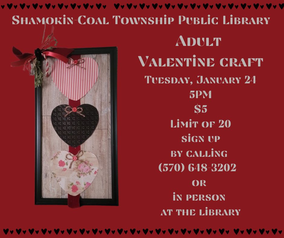 Join us for the next adult crafting event at the library on Tuesday, January 24 at 5 PM. This month we will be making Valentine’s Day themed picture frames. With only so many spots available, be sure to sign up soon while there’s still time. A $5 donation is required from all those that will be attending this event.