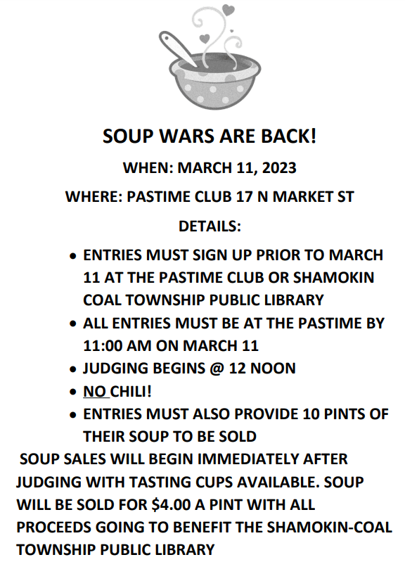 Upcoming Library Fundraiser February 19, 2023 sctplibrary Whip up a batch of your best soup and compete! All proceeds to benefit Shamokin-Coal Township Public Library. Share this:TweetLike Loading... Related