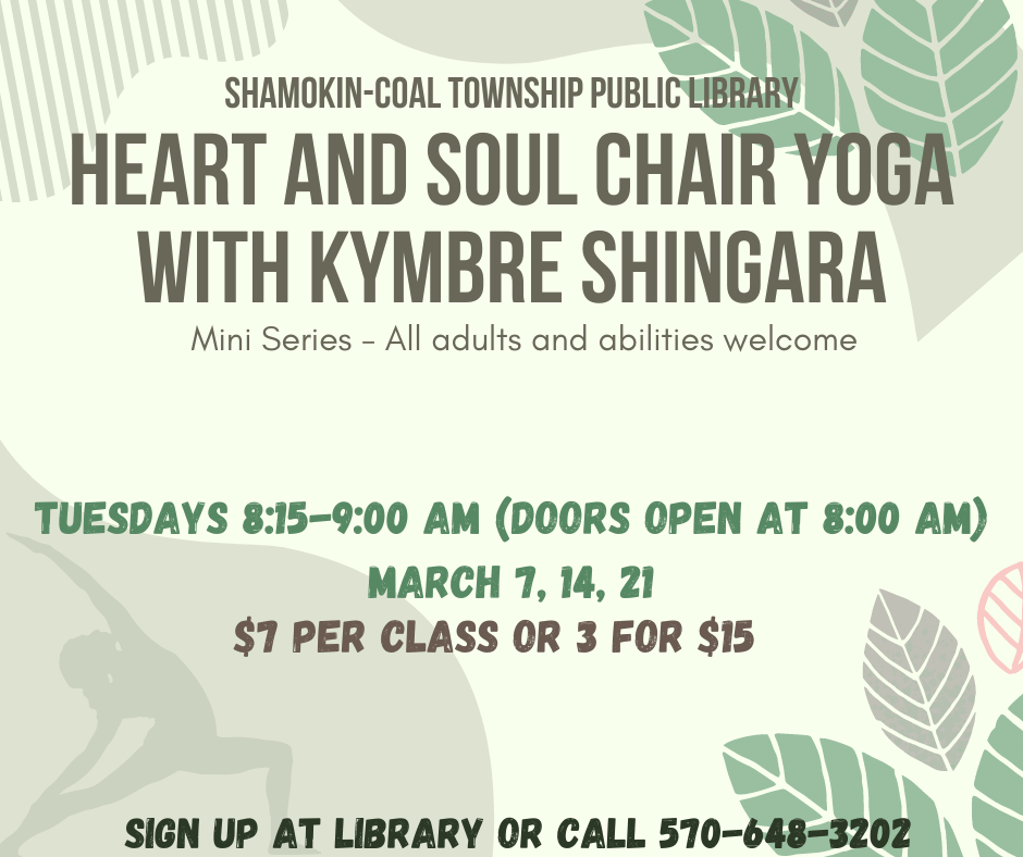 Tomorrow morning at the library the second session of Heart & Soul Chair Yoga will be held at 8:15 AM with doors opening at 8:00 AM. Remember, it’s okay if you weren’t able to attend the first session but would still like to explore this beneficial physical and mental activity. Adults of all abilities are welcome to join us!