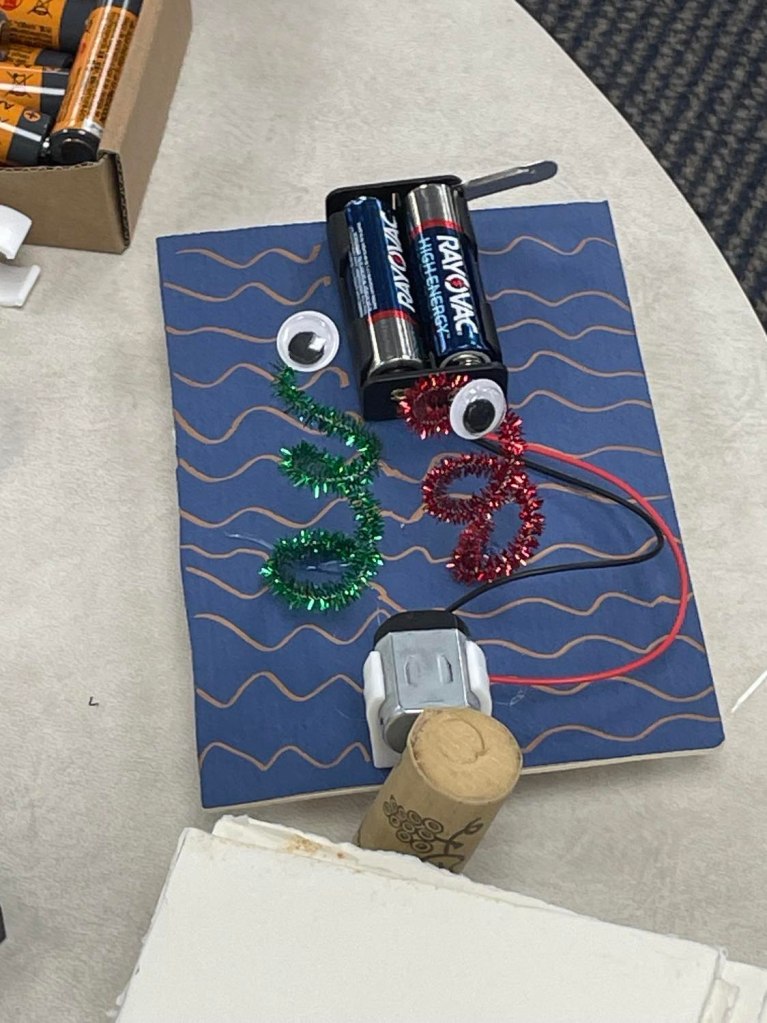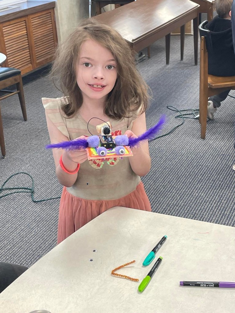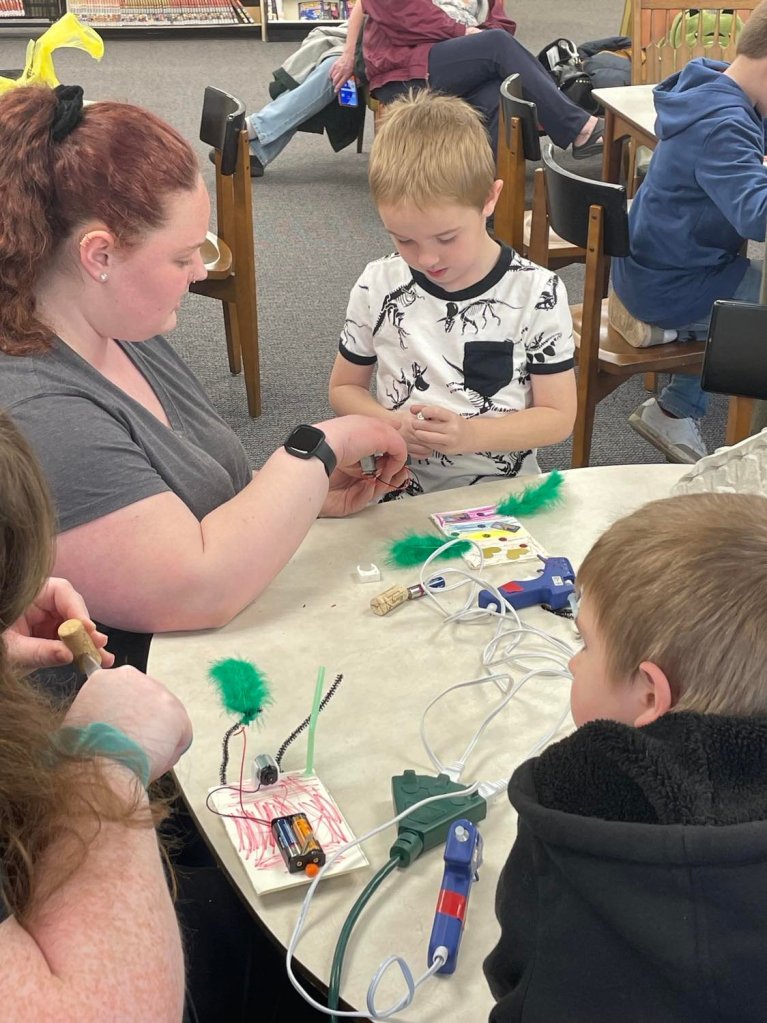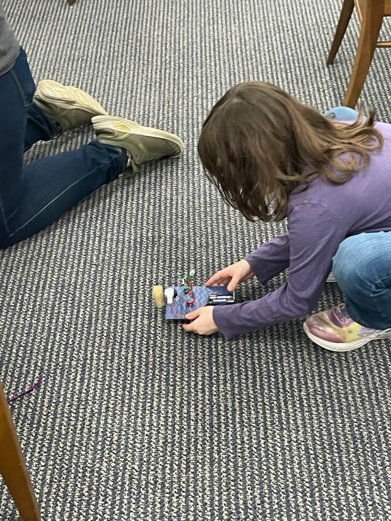 Yesterday evening at the library was spent making mobile robots during our monthly STEM program. Everyone got to design a robot, learn how to properly connect and align the electrical components, and then the robots were off to the races!