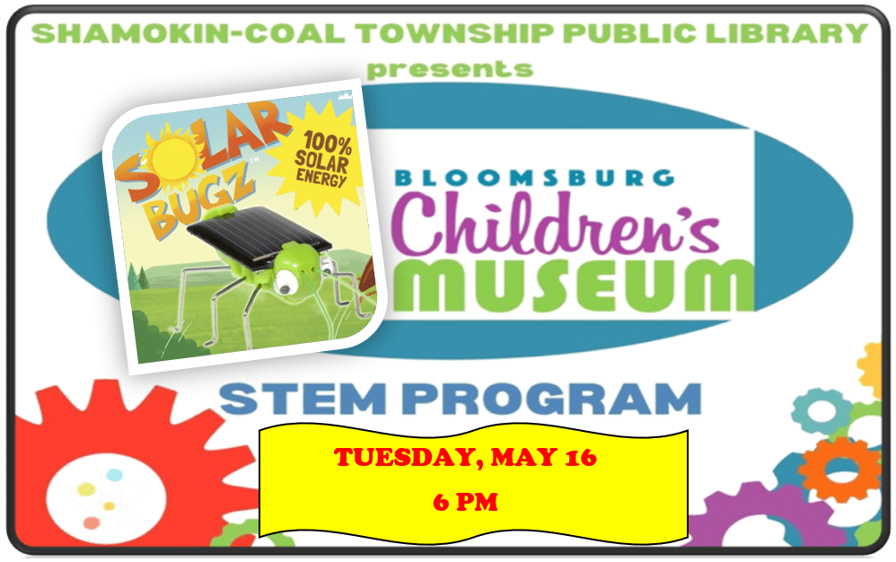 **REMINDER** Join us at the library tomorrow (5/16) evening at 6 PM for the next STEM program! This month’s program is “Solar Bugs” where we’ll be learning about solar energy, how it’s captured, and what it can be used to power.