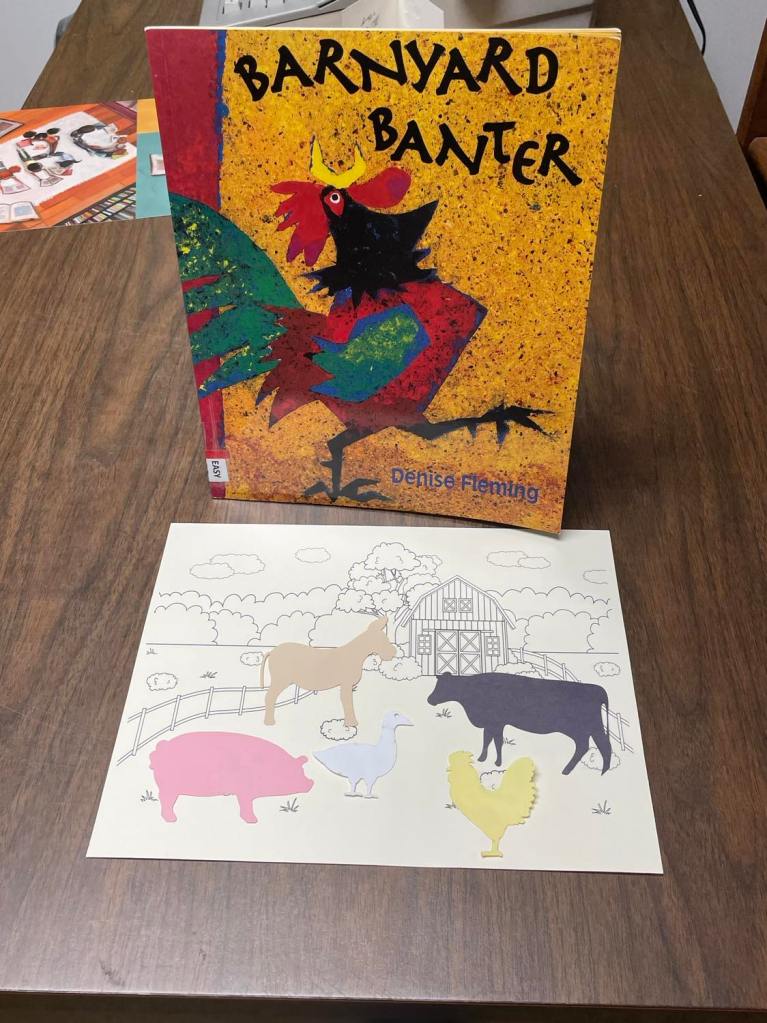 This morning at story time we read “Barnyard Banter” and encountered a whole host of animal friends including cows, pigs, donkeys, roosters, and even a goose! Following the story and song time, we got to make barnyards of our own and filled them up with the animals featured in the story.