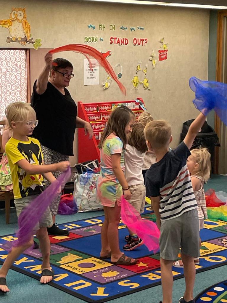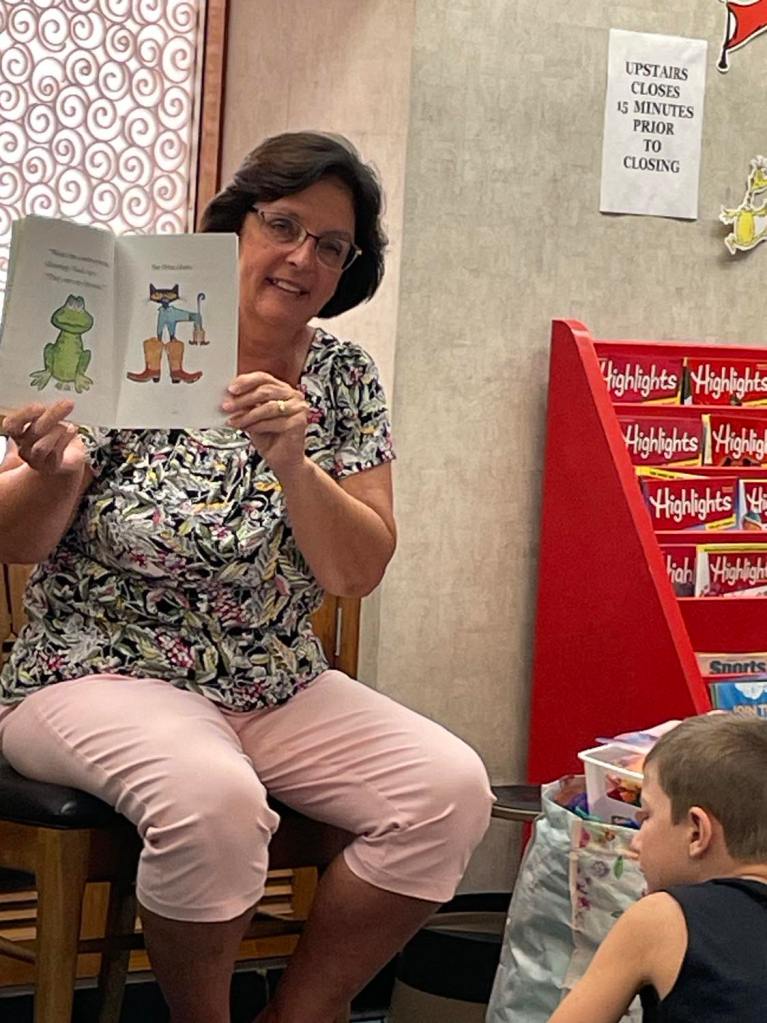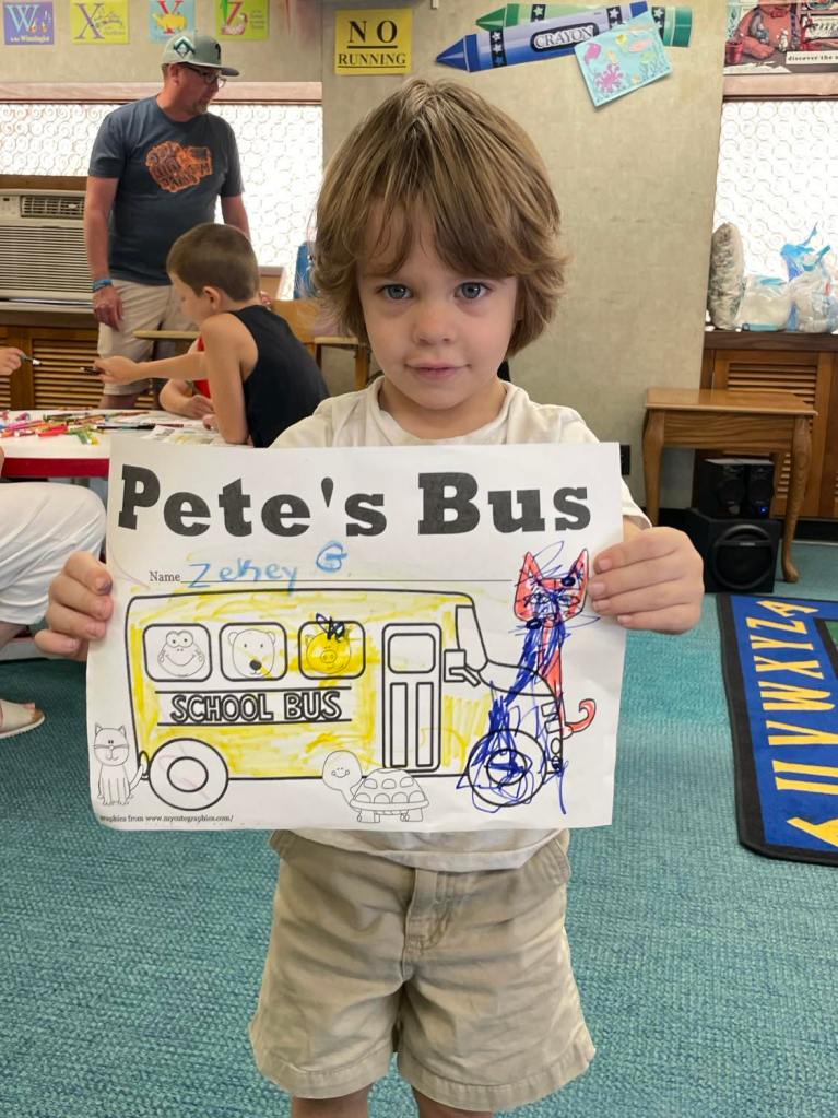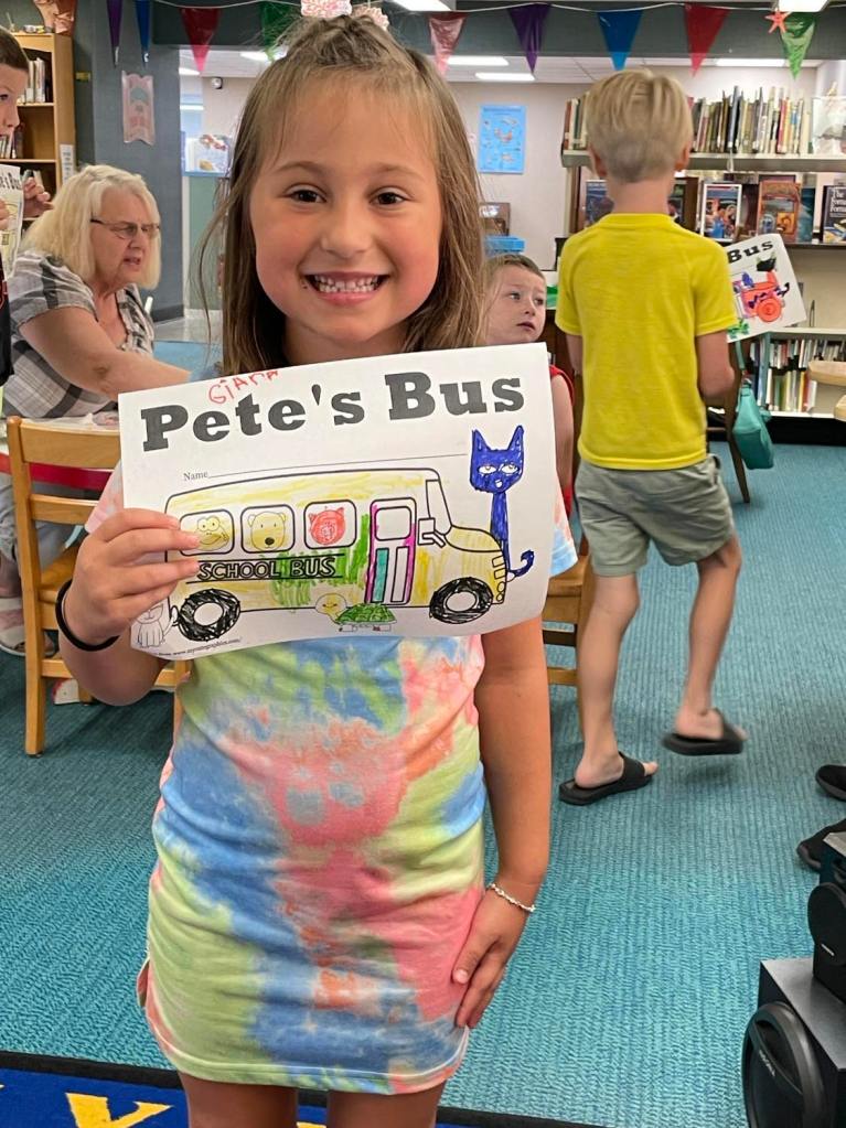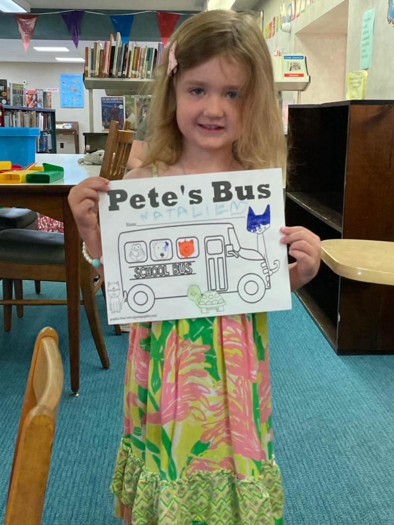 This morning at Preschool Storytime & Movement we read “Pete the Cat: Too Cool for School” since it’s that time of the year again. Library volunteer Chris Backes was our special reader this morning and we’d like to thank her for reading the story and for frequently assisting us with this program week to week!