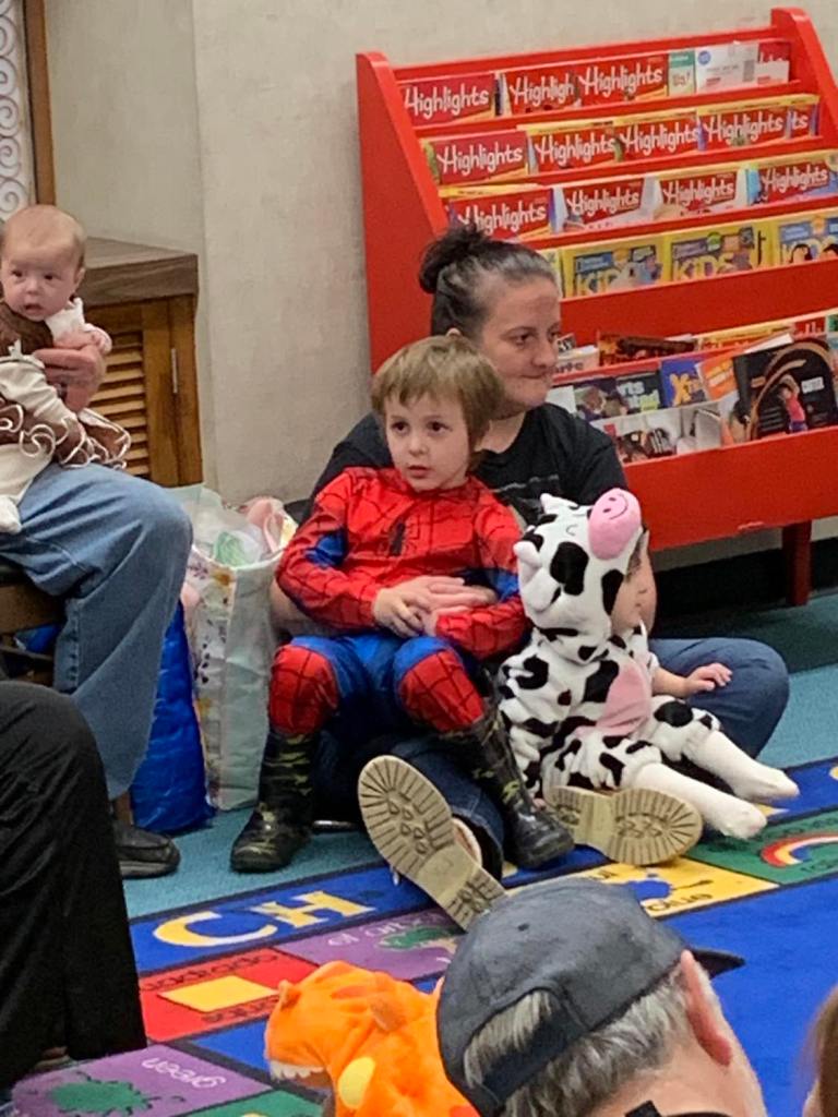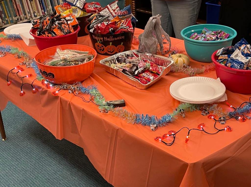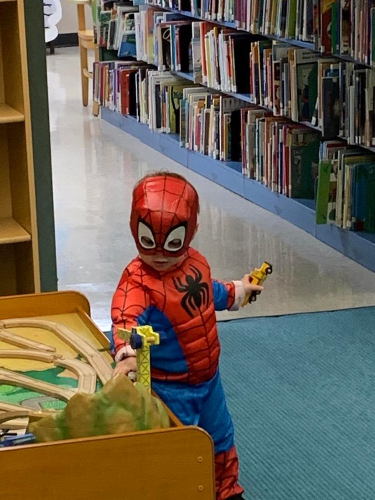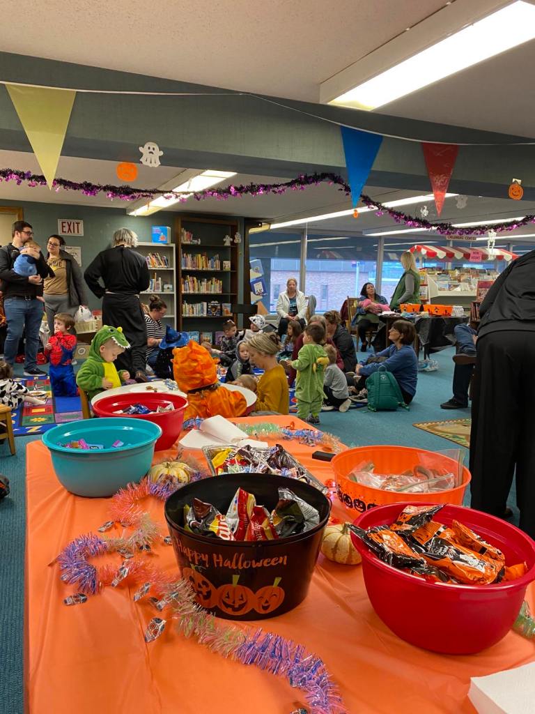 It was prime time for Halloween festivities this morning at the library for the whole Preschool Storytime & Movement crowd. After a quick story all about Halloween and some songs, we jumped right into the candy and all the other assorted goodies!