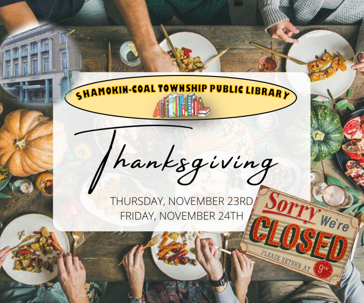 Shamokin-Coal Township Public Library will be closed tomorrow for Thanksgiving along with Friday. From all of us here at the library, may everyone have a very happy Thanksgiving holiday! We are so thankful for our patrons, our community, and all those who have given their time and talents in making this a wonderful year for our library.