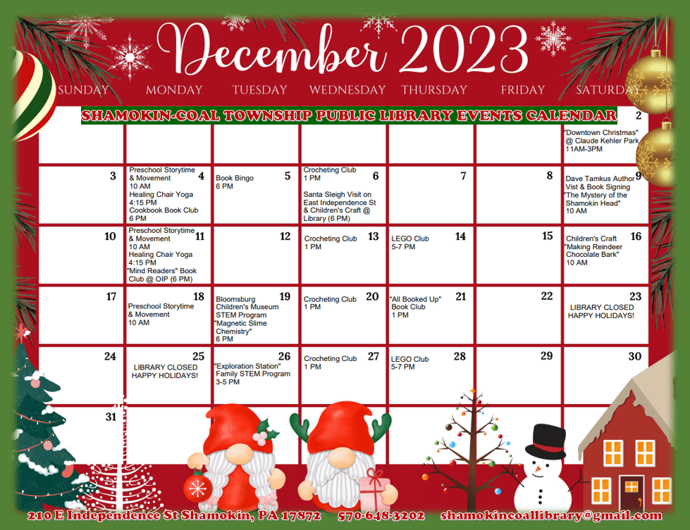 Keep up to date with everything happening at your local library this December! Printed calendars are readily available at the front desk along with handouts that include additional information about upcoming programs and events.