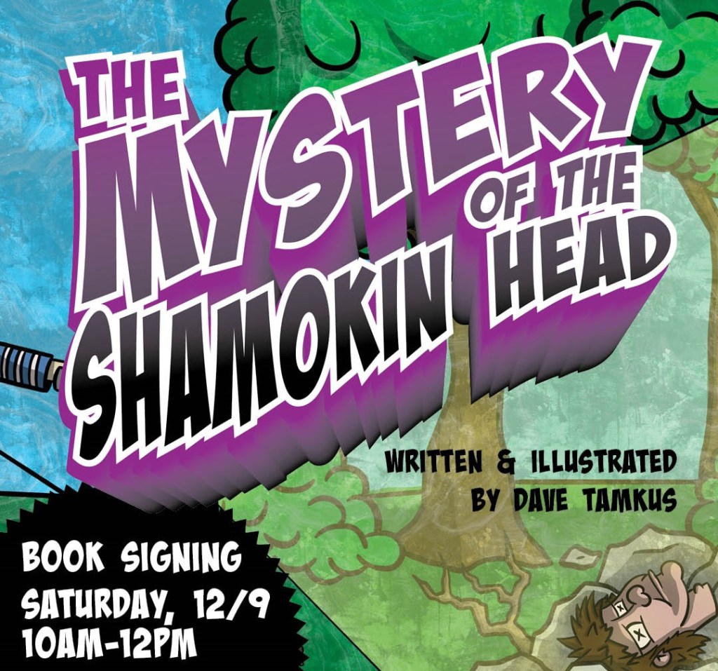 Join us at the library this coming Saturday (12/9) for a special visit and book signing with author/illustrator Dave Tamkus starting at 10 AM! Mr. Tamkus will be signing copies of his recent publication “The Mystery of the Shamokin Head” which takes us down the path of some very interesting local history accompanied by vivid illustrations all throughout.