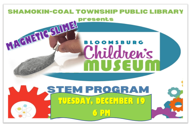 Don’t forget that our monthly STEM program presented by Bloomsburg Children’s Museum will be held at the library next Tuesday (12/19) at 6 PM. This month we’ll be looking into magnetic slime chemistry, where we will learn how to make the material and will certainly have fun playing with it afterwards!
