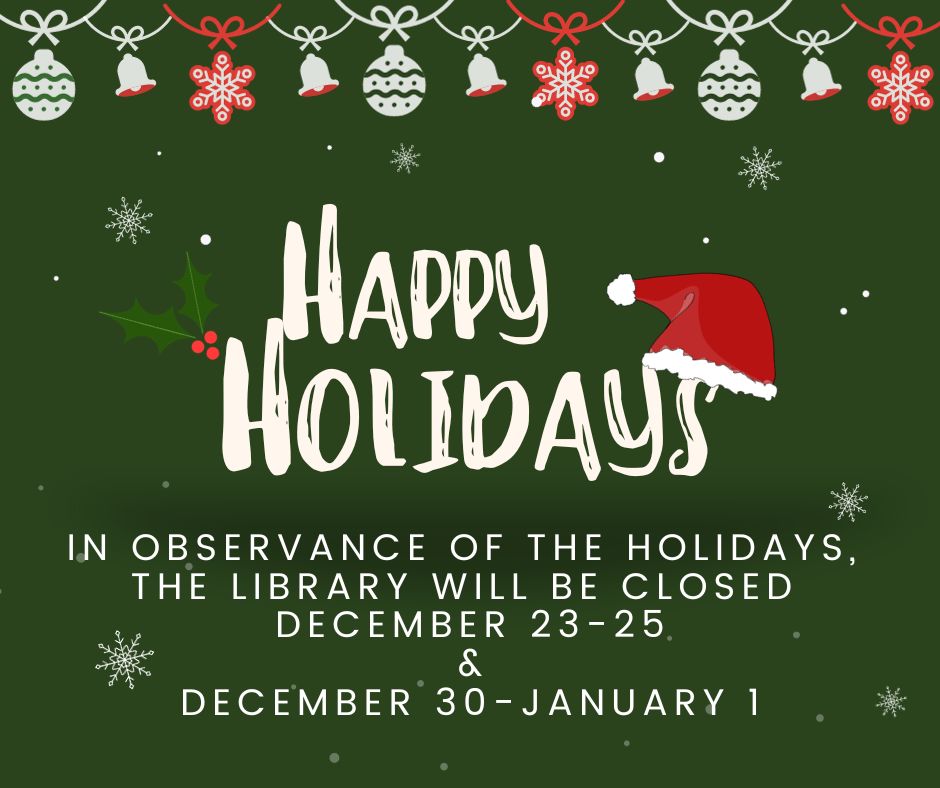 Be sure to stop by the library before 5 PM today to load up your sleigh with all your favorite festive books and movies for over the long holiday weekend! We will be closed tomorrow (12/23) through Christmas Day with regular hours resuming on Tuesday (12/26).