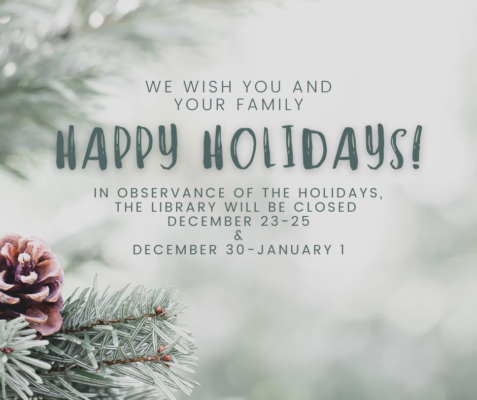 Just a reminder that we will be closed tomorrow (12/30) through New Year’s Day with regular hours resuming on Tuesday (1/2) and of course Book Bingo later on that evening at 6 PM.