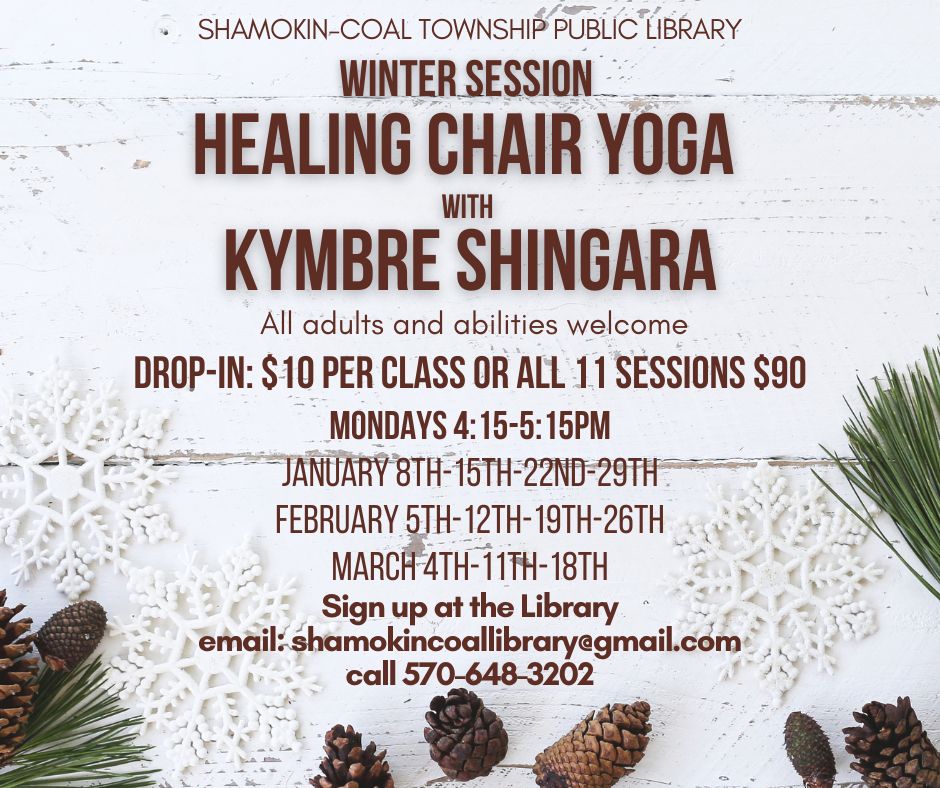 Healing Chair Yoga with instructor KymBre Shingara will be returning to the library for winter sessions! Classes will once again be held on Monday afternoons from 4:15-5:15 PM at a cost of $10 per class or $90 for all eleven sessions that will run from January through March. All adults and abilities welcome!