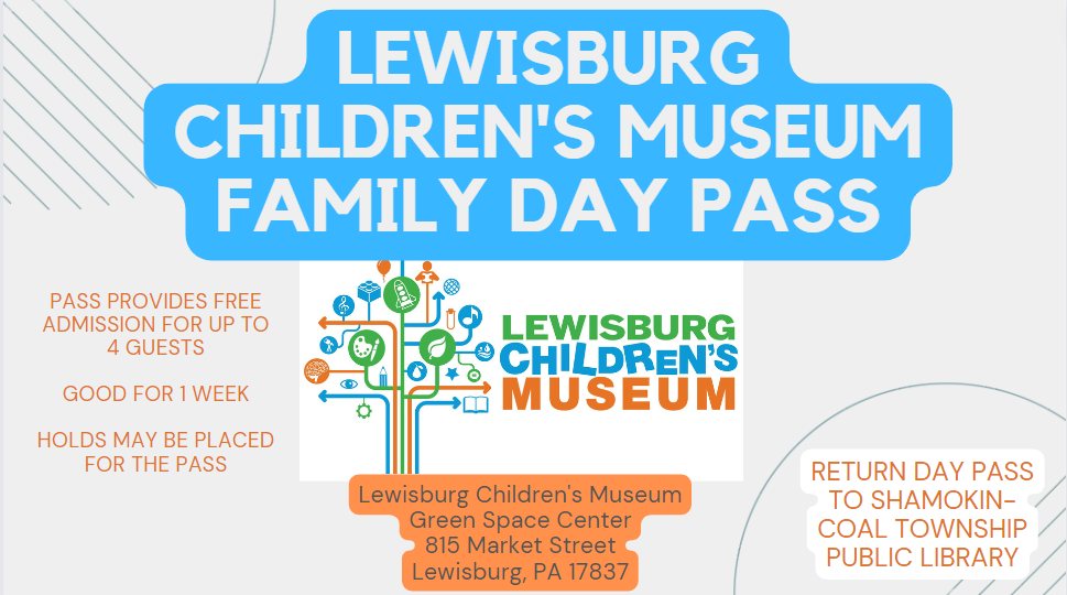 Just a reminder that the library is offering our patrons this fantastic opportunity! The Museum Cultural Pass program is part of Lewisburg Children’s Museum’s “Count Me In” initiative and provides free admission to the museum.