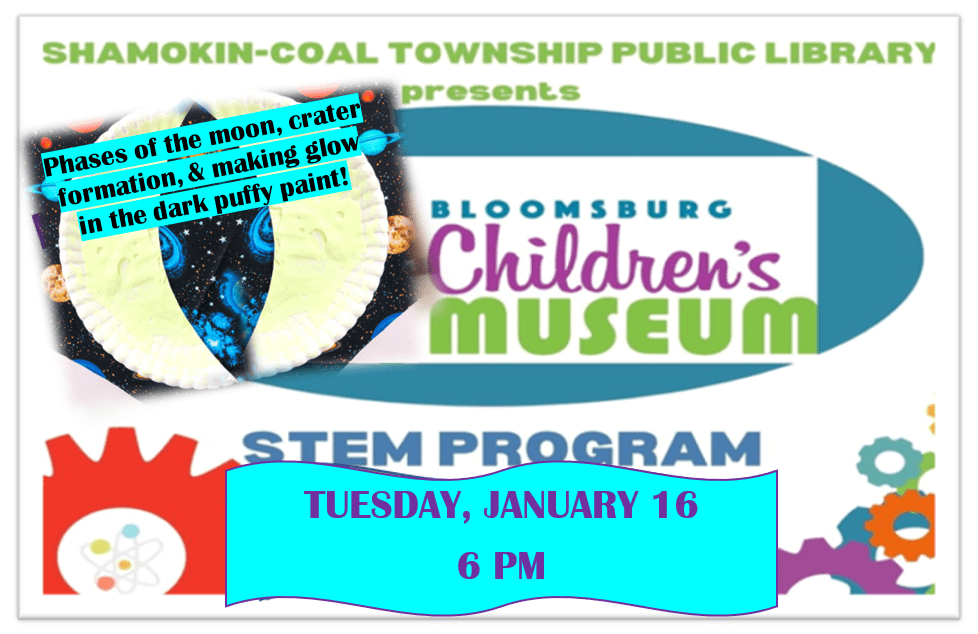 Mark your calendars for this coming Tuesday (1/16) at 6 PM for our monthly STEM program visit from Bloomsburg Children’s Museum. This month we’ll be learning about the phases of the moon, crater formation, and then will be making some glow in the dark puffy paint to wrap up the lesson!