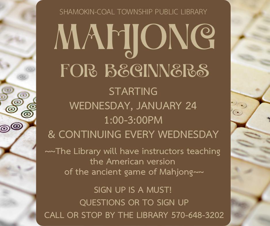 We have a new addition to the weekly library happenings. Are you interested in learning a new game? Want to come and have some midweek fun? Join us next Wednesday at 1:00 upstairs to learn the American version of the ancient game of Mahjong. Sign up is a must and this is an adult only event.