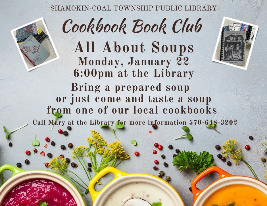 Just a reminder that the Cookbook Book Club will be meeting at the library this evening at 6 PM! This month the theme is soup and everyone is encouraged to bring a prepared soup or you can simply come and taste a soup made from a recipe out of one of our local cookbooks.