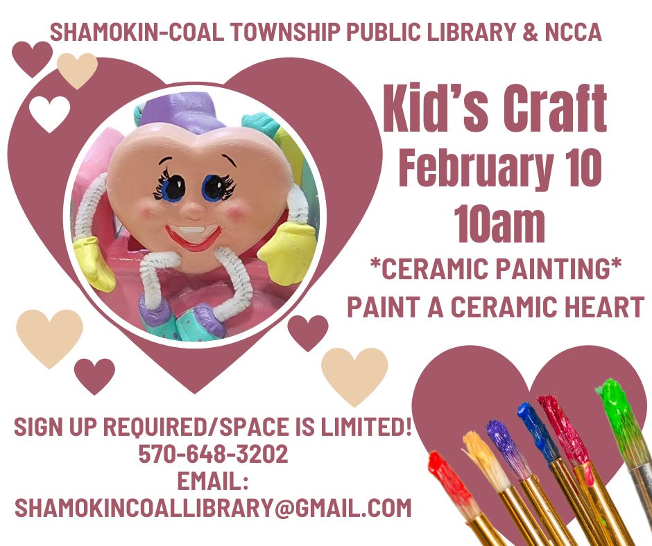 Join us at the library next Saturday (2/10) at 10 AM for a Valentine’s Day kid’s craft! This month we’ll be painting ceramic hearts, so wearing some older clothes may be in order. Space is limited and sign up is required. Be sure to claim your spot soon by giving us a call or sending an email to the address listed below!
