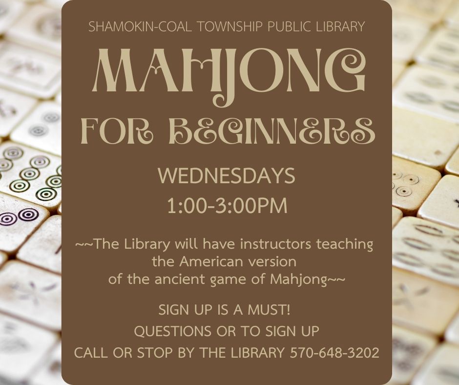 Join us this afternoon for Mahjong! This new program for adults is held at the library every Wednesday from 1-3 PM. If you’d like to learn the American version of this game, sign up is a must so please visit us at the library, give us a call, or send an email to shamokincoallibrary@gmail.com.