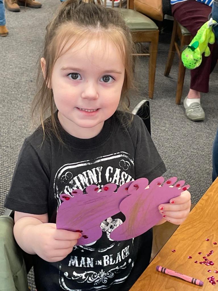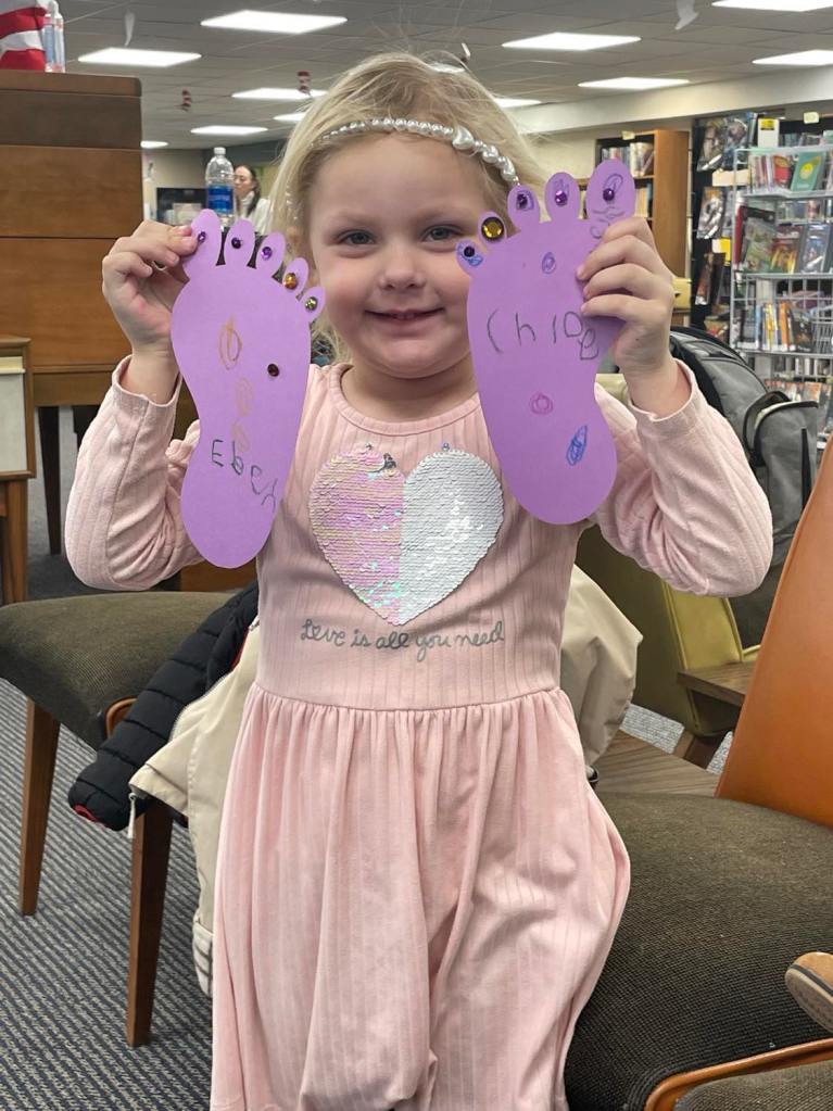 This morning at Preschool Storytime & Movement we read the Dr. Seuss classic “The Foot Book” followed by our regular songs. After that, we got started with this week’s craft where everyone got to decorate and bedazzle two feet of their own any which way they liked!