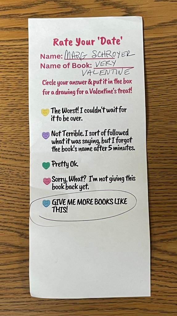 Congratulations to Marg Schroyer as the lucky winner of the library’s “Rate Your Date” gift card drawing! Please stop by the library sometime this week to collect your prize winnings. Additionally, thank you to all of our patrons that participated throughout February and best of luck next year!
