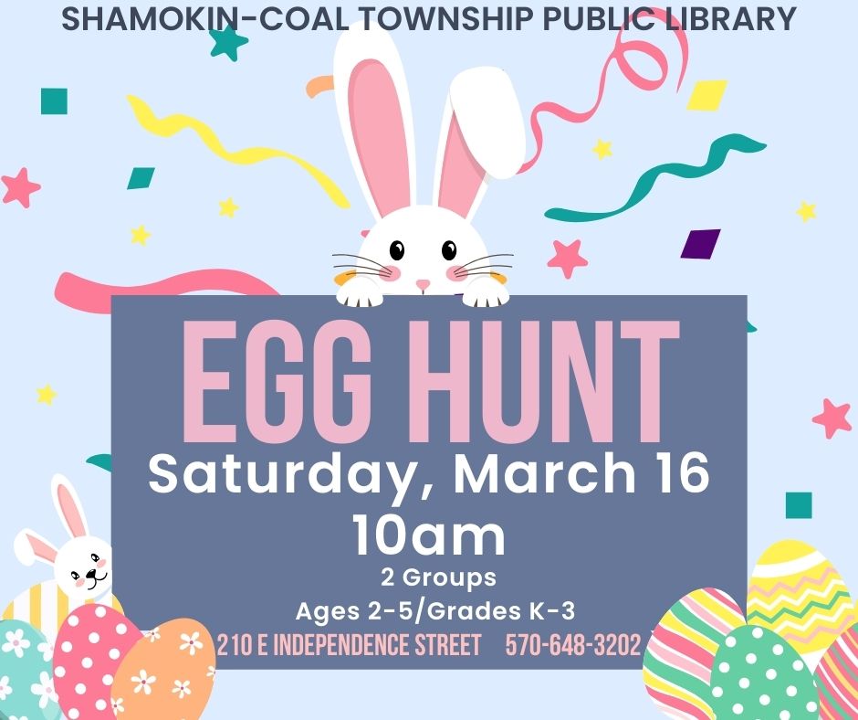 The library’s third annual Egg Hunt is now only 2 weeks away! This event will be held Saturday, March 16 starting at 10 AM on the second floor of the library. Like in previous years, the kids will be split into two groups (ages 2-5 or grades K-3) in order to keep things fair. There’s no need to sign up for this event, simply bring your basket/bag and be ready to hunt.
