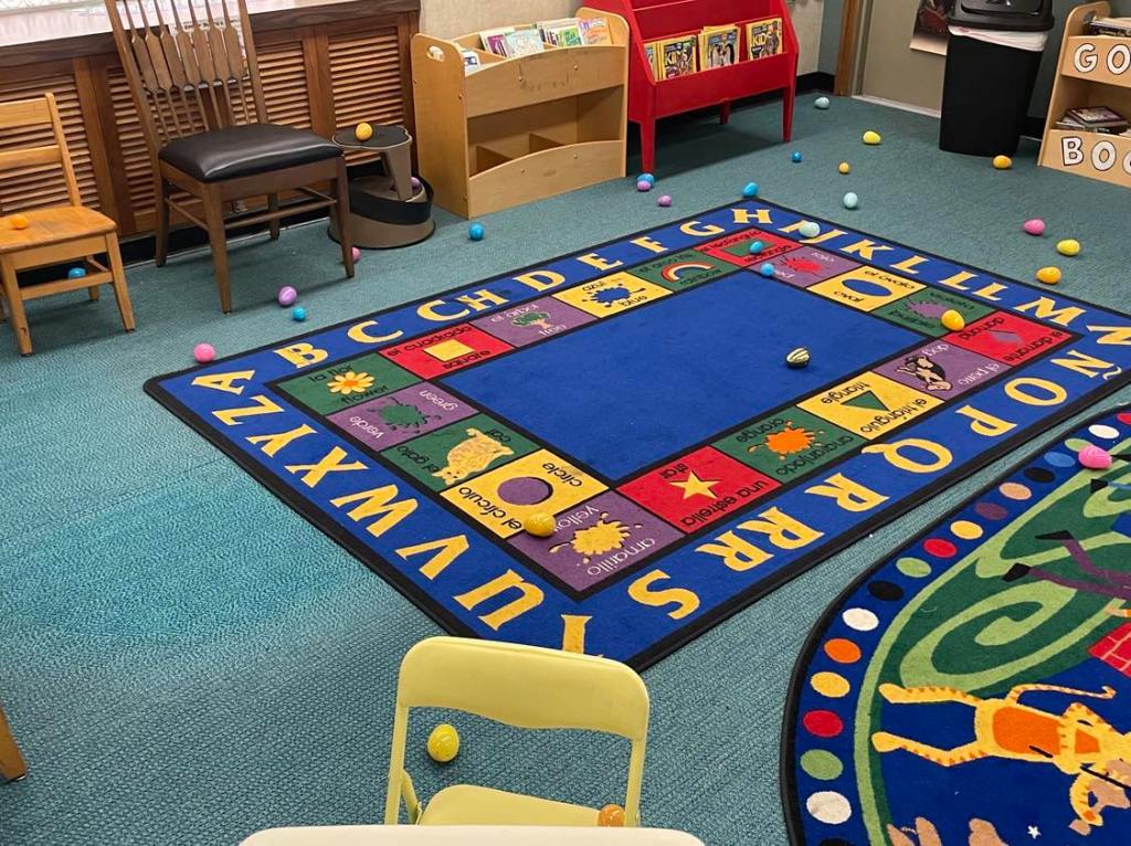 Little did we know that while we were having our morning fun together, eggs were busy being hidden all over the other side of the library for a miniature egg hunt!