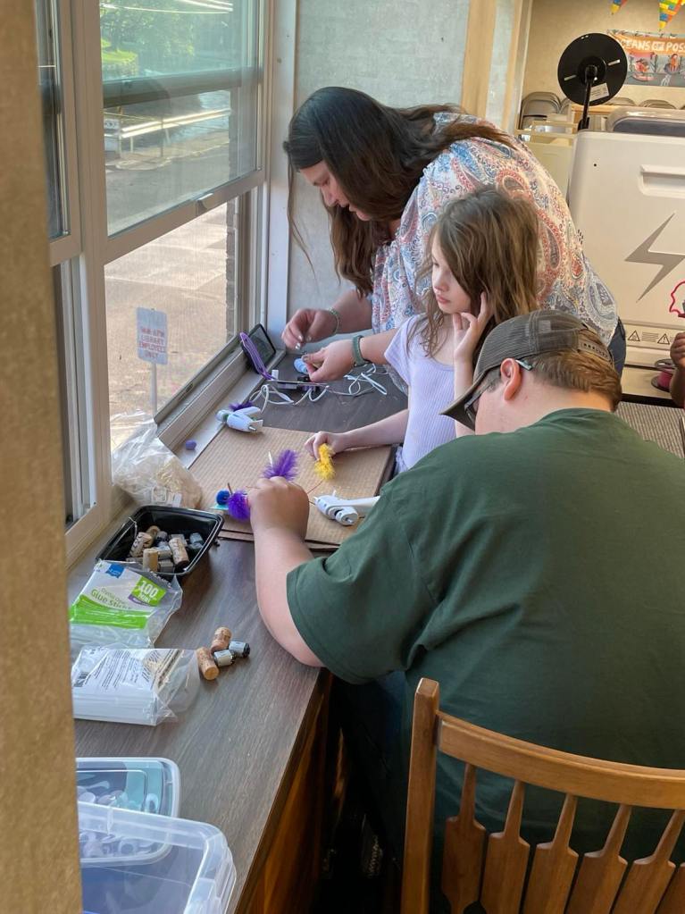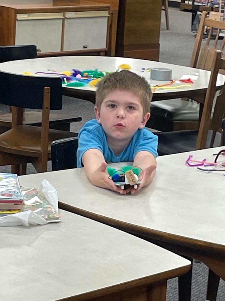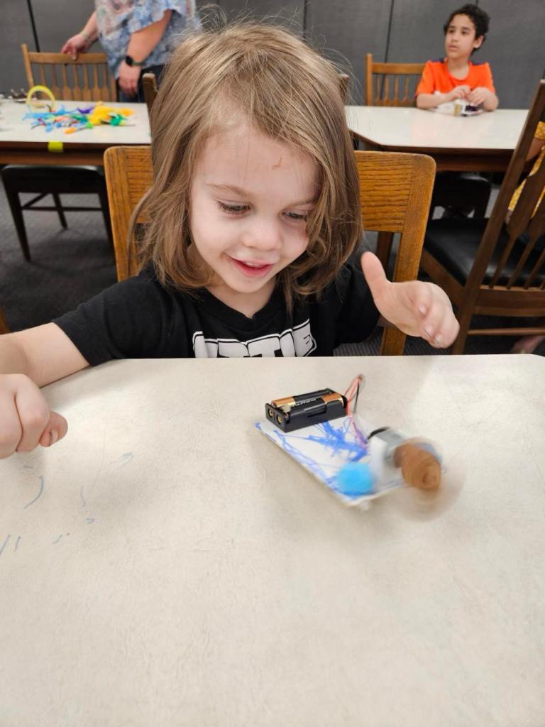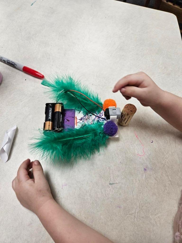 Earlier this evening at the library everyone had the chance to build vibrating motor powered cars, complete with feathers in some cases! Through the lesson and the project, we got to learn about simple circuits and how vibrating propulsion systems work.