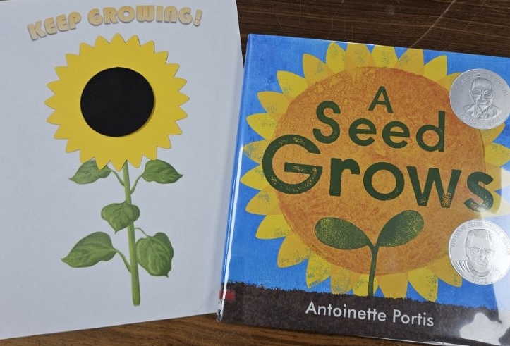 Earlier this week at Preschool Storytime & Movement we read “A Seed Grows” which was about how sunflowers grow and develop, sang our regular songs, did some flower crafting, and then closed with a tasty snack as always!