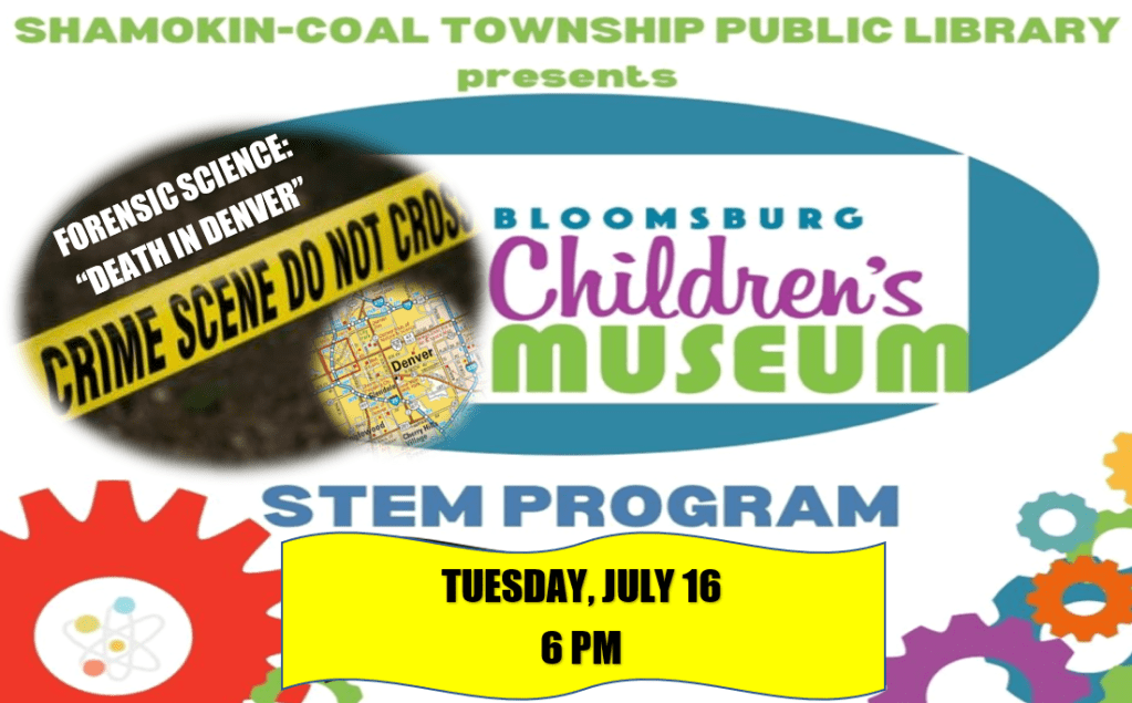 Just a reminder that this Tuesday (7/16) at 6 PM Bloomsburg Children’s Museum will be making their monthly visit to our library! This time around, we’ll be delving into forensic science and working to solve a “Death in Denver” by investigating blood splatter, DNA evidence, and skeletal remains. To sign up for this free event, either stop by the library or give us a call at 570-648-3202.