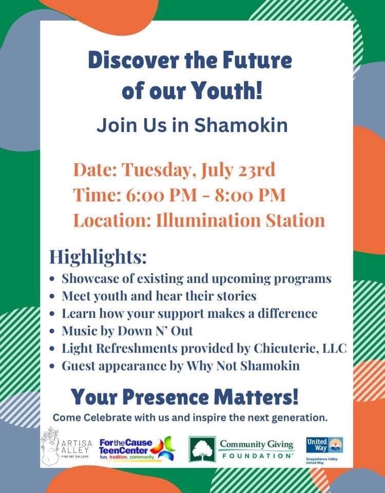 Come out to celebrate or maybe even inspire the next generation with a youth programming event in Shamokin! Happening tomorrow evening (7/23) at Illumination Station from 6-8 PM, this event will showcase all the exciting opportunities available for young people across our local area including scholarship offerings along with the launch of the Community Giving Foundation’s Youth in Philanthropy program held at Shamokin Area High School.