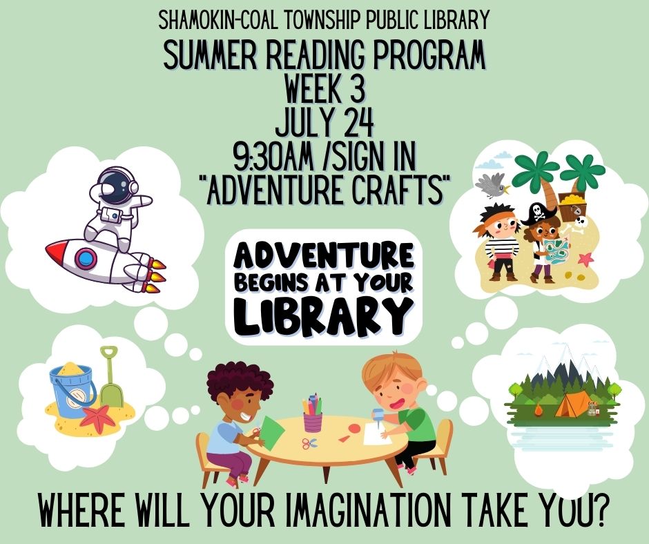 Join us for Summer Reading Week 3 at Shamokin-Coal Township Public Library! Tomorrow morning (7/24) we will be embarking on an Adventure Crafts program that will feature several activities/project stops along the trail that’ll give everyone the chance to get creative and use their imaginations. These will include paper chain snakes and much more!