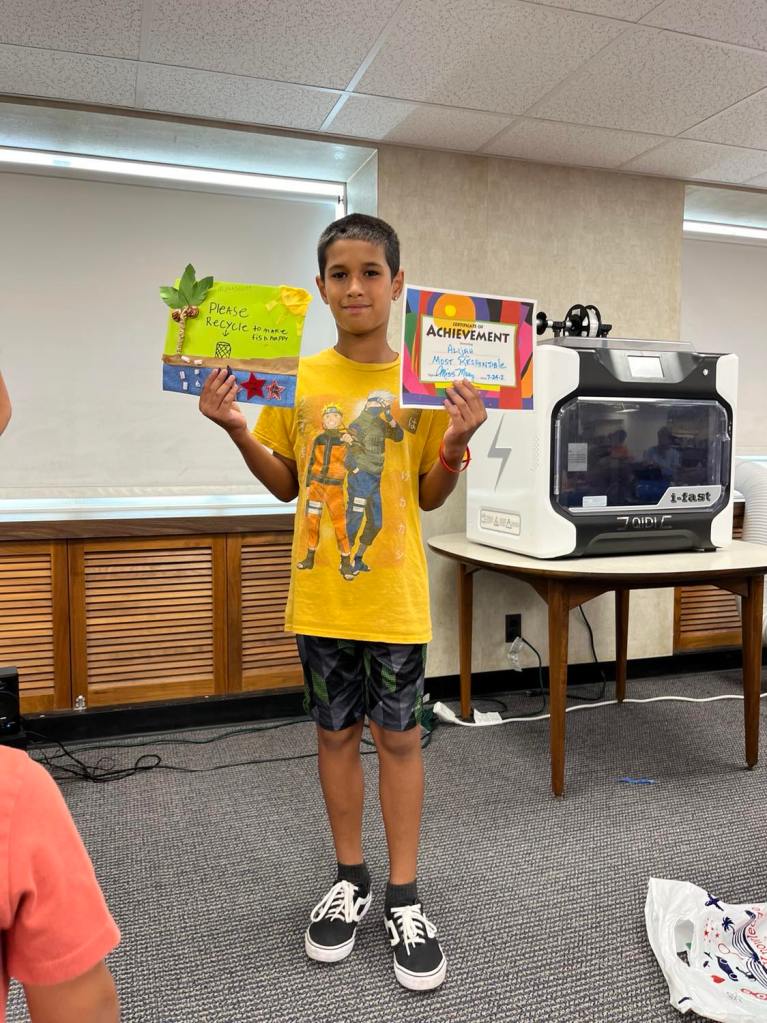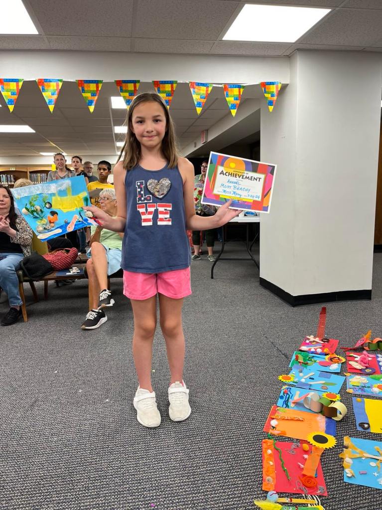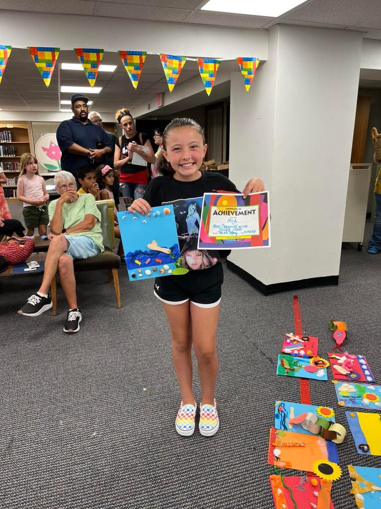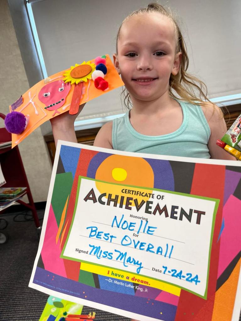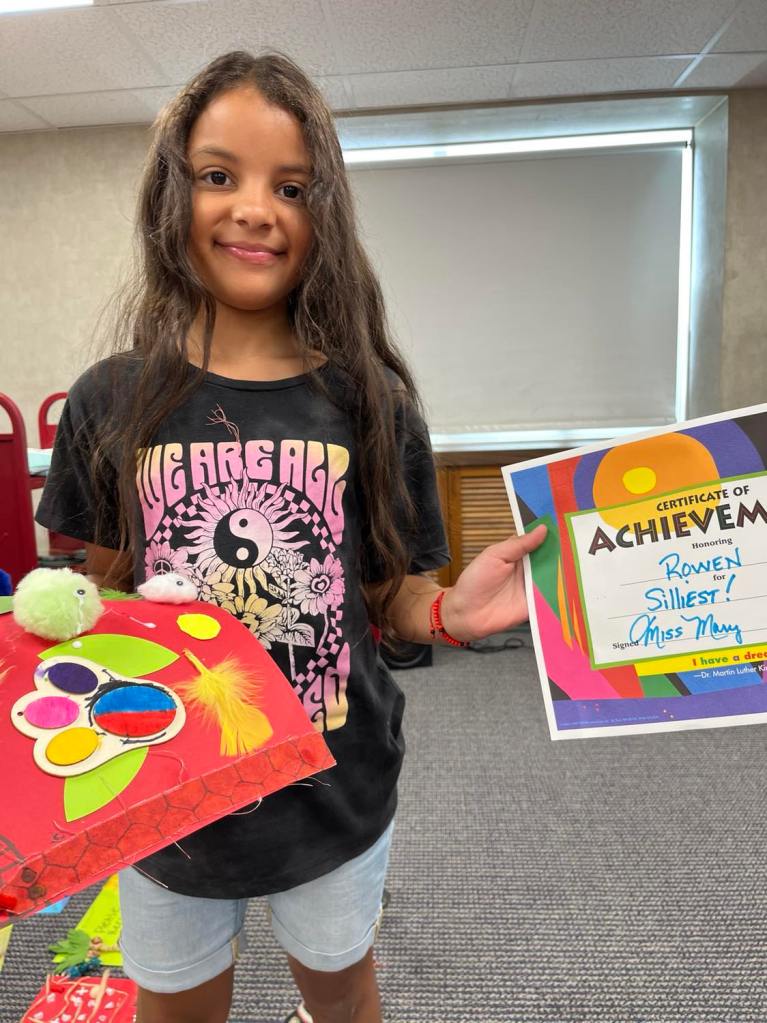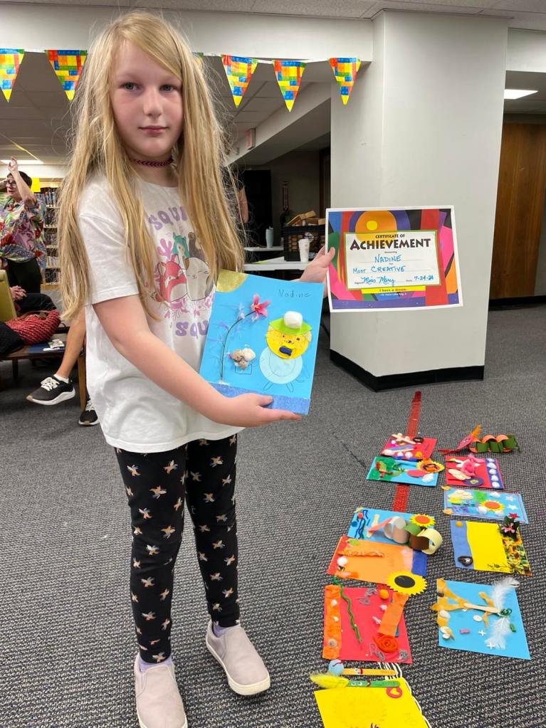 Last week as part of the Adventure Crafts program, everyone was given a “mystery bag” filled with randomized crafting supplies to work with and encouraged to let their imaginations lead the way. While each completed project shined in its own right, we thought we’d give special recognition to a few that really stood out to us! Award categories included silliest, most colorful, most creative, and a few others.