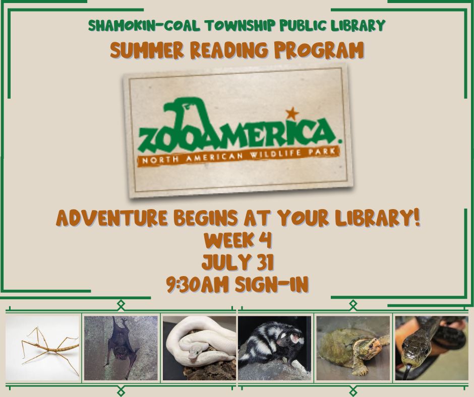Join us for Summer Reading Week 4 at Shamokin-Coal Township Public Library! Tomorrow morning (7/31) ZooAmerica will be visiting us from Hershey, PA along with several animal pals that we’ll get to see and learn all about.