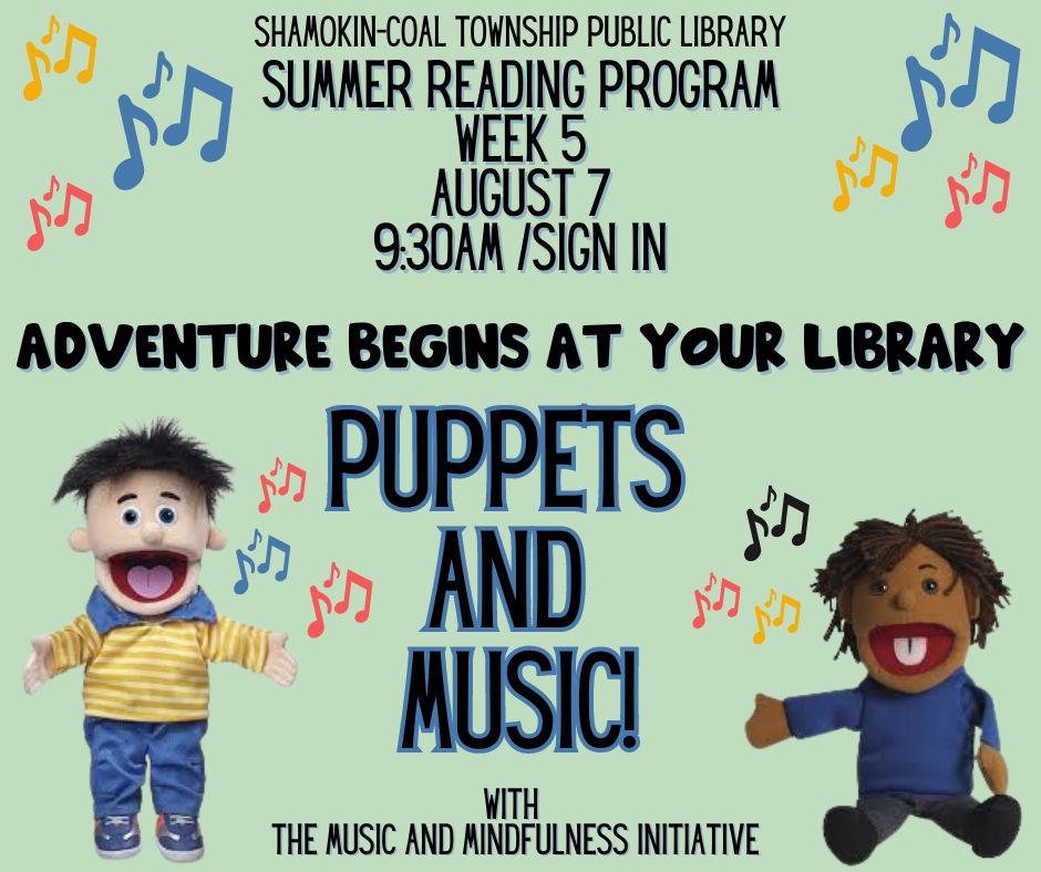 Join us for Summer Reading Week 5 at Shamokin-Coal Township Public Library. Tomorrow morning (8/7) we’ll be visited by The Music & Mindfulness Initiative along with their puppet friends for a spectacular show!